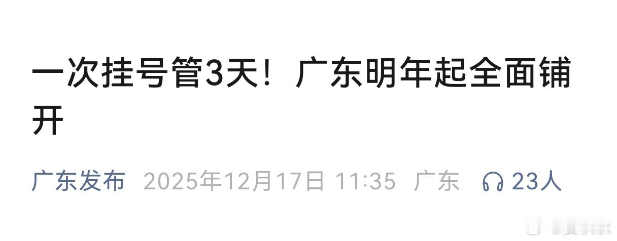 一次挂号管三天从明年1月1日起,广东省全面推行“一次挂号管三天”就医政策。个人感觉,这是值得鼓励的探索。广东准备推行的做法是,患者首次挂普通号后,未能在当天获得完整诊断或检查报告。那么在这种情况下,医院需为患者预约一次免费续诊号,用于解读结果、开药等后续诊疗。我注意到,“一次挂号管三天”,已经在江苏、上海等一些医疗机构试行。比如在江苏,“三天”指的是“就诊当天及后续两天”。具体的规定是,“普通门诊患者就诊当日,因检验、检查不能完成或不能获取报告的,在三日内含首次就诊当日,携检查、检验结果到同一院区、同一科室回(复)诊时,才能享受免缴挂号费。而广东省明年起全面推行,这是需要勇气的。因为在实际操作中,“一次挂号管三天”是比较复杂的。比如,检查结果没出来才能享受。比如,诊疗已经完成的,或者要换科室的,就不能享受。广东试行的措施中还明确,续诊号不能指定医生,只能预约一次,候诊也要正常排队。很显然,尽管医疗机构麻烦了不少,但“一次挂号管三天”这种跨前一步的做法,切中的是就医的痛点,无疑老百姓会欢迎。不管什么时候,为老百姓多做一件事,多做一点事,都是善意的最大体现。明年起广东一次挂号能管三天晏秋秋
