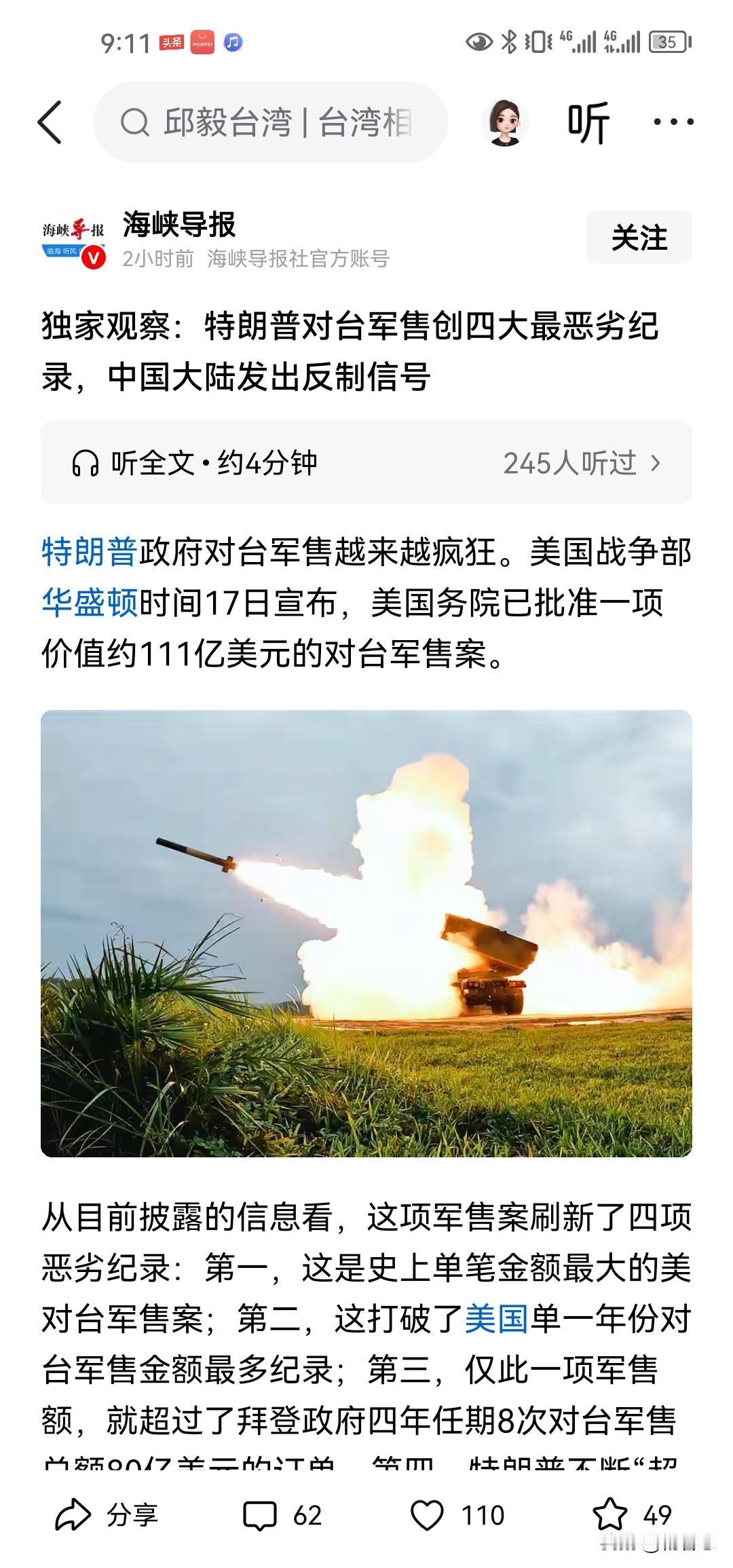 特朗普政府对台军售创历史记录,极,极其恶劣,我们必须做出反应,可以加大对外情报收集。只要美国的军机军舰拉武器进入南海台海就可以拦截必要时不惜摧毁,同时中国要加大对委内瑞拉的军售。别说委内瑞拉穷。委内瑞拉不穷,他很多石油,可以用石油来换武器,我们不要他的美金,只要他的石油就可以,中国的军舰潜艇可以开到委内瑞拉海域了。美国只对硬实力表示尊重。有实力也要发出来才被尊重,有实力隐藏起来不敢发挥也是没用。