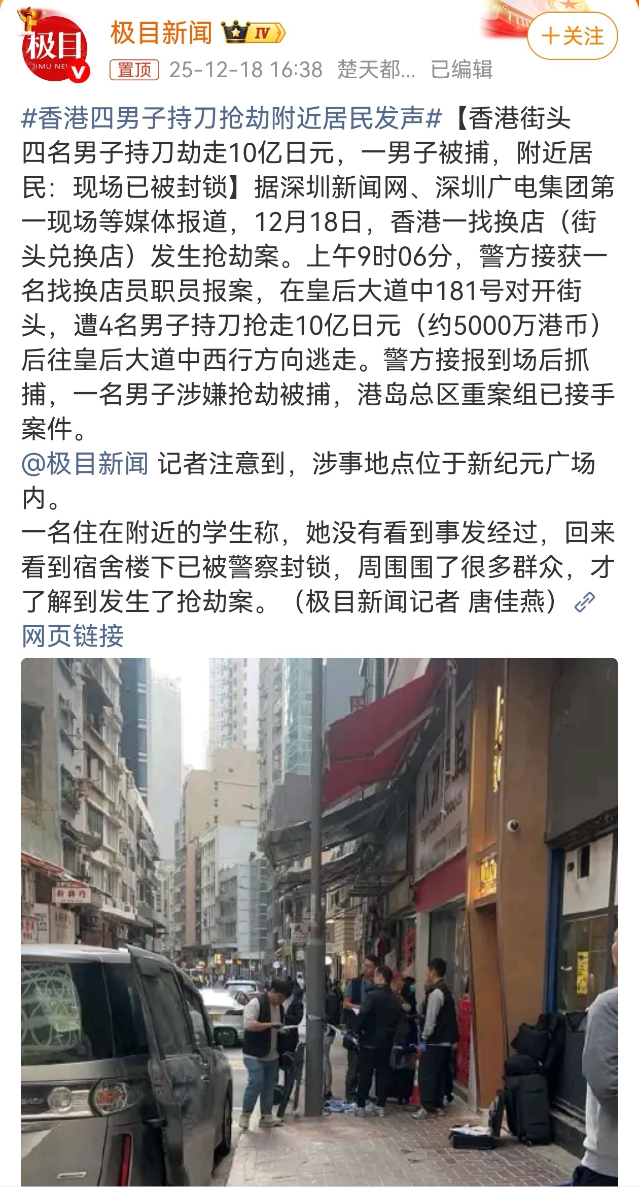 12月18日,香港中环皇后大道中181号新纪元广场,一家货币兑换店遭遇特大抢劫,4名男子持刀逼近两名找换店职员,抢走4个行李箱,内装10亿日元现金,折合约4500万人民币,随即登上接应的七座车往皇后大道西方向逃去。香港10亿日元劫案1人被捕香港四男子持刀抢劫附近居民发声随后,香港警方接到店员报警后第一时间抵达现场,并在案发地附近发现可疑七座车,当场提取指纹、掌印,同时在上环地铁站出口截获一名43岁持港澳通行证的内地男子,缴获部分日元现金,以涉嫌“抢劫罪”拘留,其余3人仍在逃。案发时,两名店员员正准备把巨款运往附近汇丰银行兑换,4名蒙面男子在光天化日持刀抢劫,且作案全程不足1分钟,这是香港近年罕见的高额现金街头劫案,也是继9月“65公斤黄金劫案”后,本年度再次发生的“半亿级”暴力抢劫。从作案手法来看,明知会被抓,还要拿刀上街抢,明显属于即兴犯罪,多数街头劫匪并非职业罪犯,多是迫于缺钱境遇想到的最直接“搂钱”方式,其作案手法并没有多高明,短时间内便被抓到一人,其他同伙落网,只是时间问题。再看该案发生地、作案时间,当时正值上班高峰,路面车流大、人群杂,让劫匪误以为趁乱易脱身。事实上,甭说在香港,哪怕是内地,在天网监控、AI实时运算的全国视频防控网下,城市公共场合的犯罪行为已无处遁形。香港10亿日元劫案1人被捕