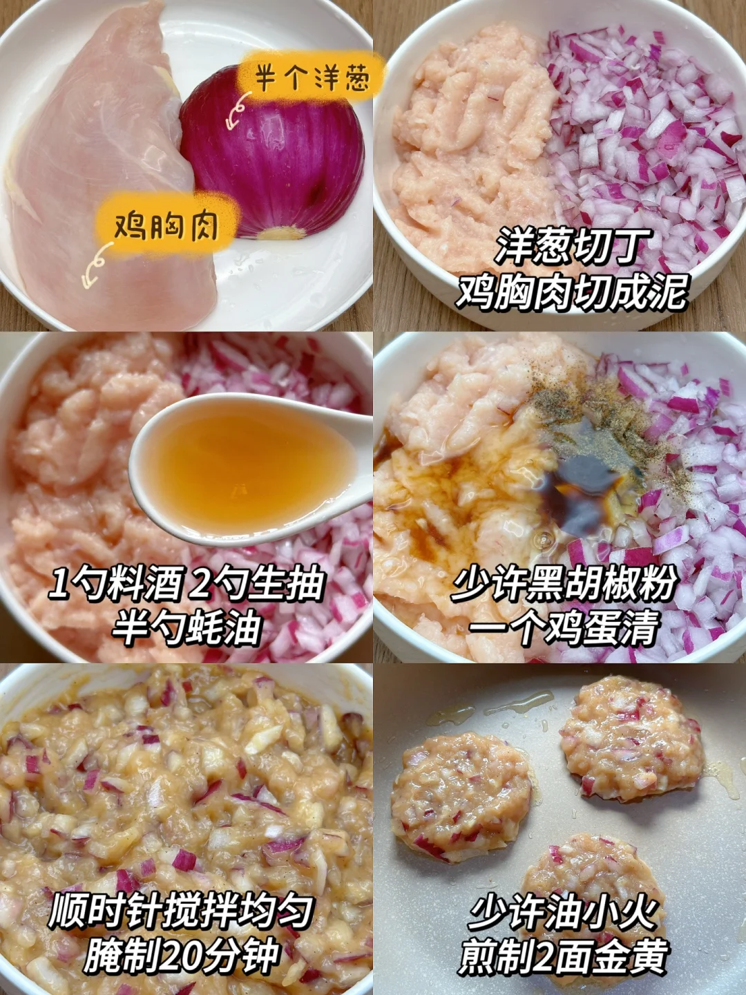 要说掉称还得是吃鸡胸肉!今天就给家人们分享一道低卡鸡胸肉饼🫓,一个饼才30多大卡,又嫩又多汁,鸡胸肉一点都不柴,真的是神仙吃法了!姐妹们这个你一定要去试试!啊啊啊真的好好吃[喝奶茶R] 咬一口还会留肉汁儿!!很难不爱!! 🥗食材:鸡胸肉、洋葱🧅 🥘做法:如图所示~ 1⃣️鸡胸肉剁碎,洋葱切丁倒入一起,再倒入一勺料酒➕两勺生抽➕半勺蚝油➕少许黑胡椒➕一个鸡蛋清搅拌均匀后腌制20分钟以上 3⃣️平底锅少许油,将鸡肉泥整成圆饼状小火慢煎至两面金黄即可出锅。