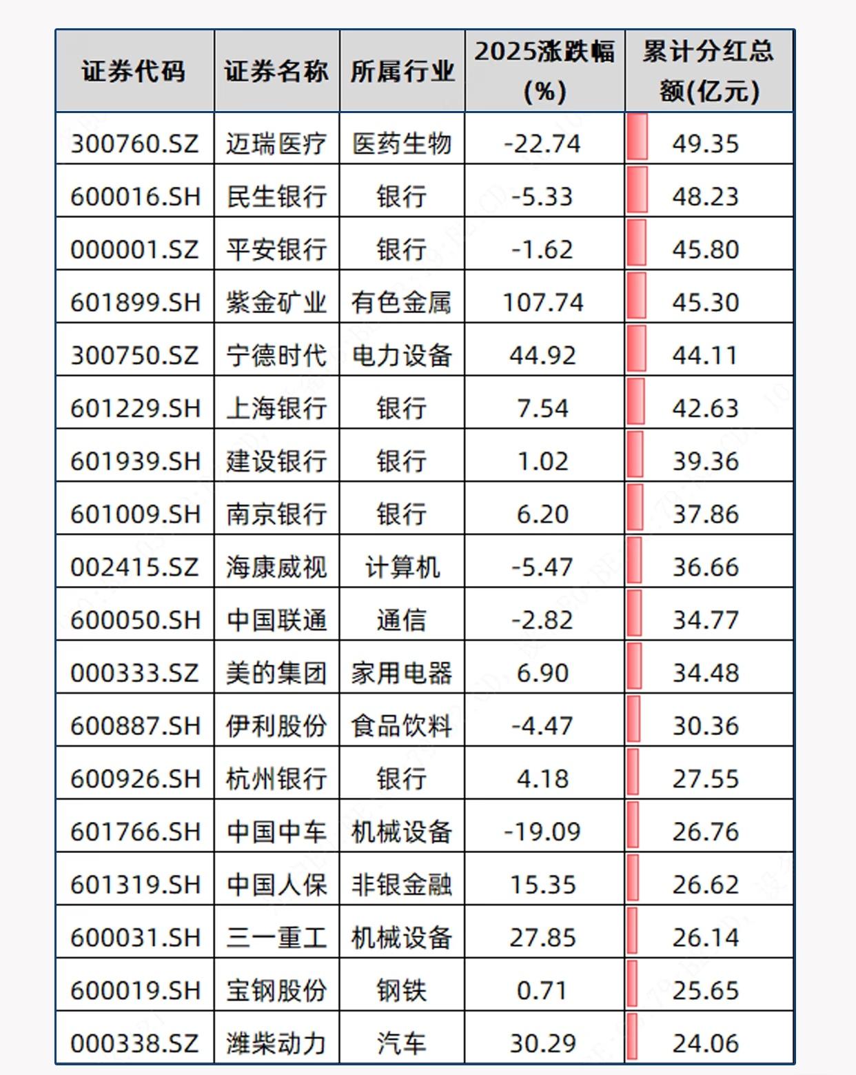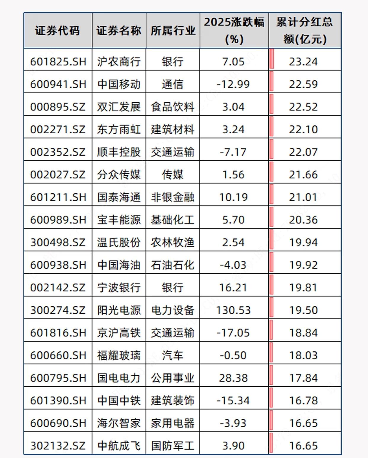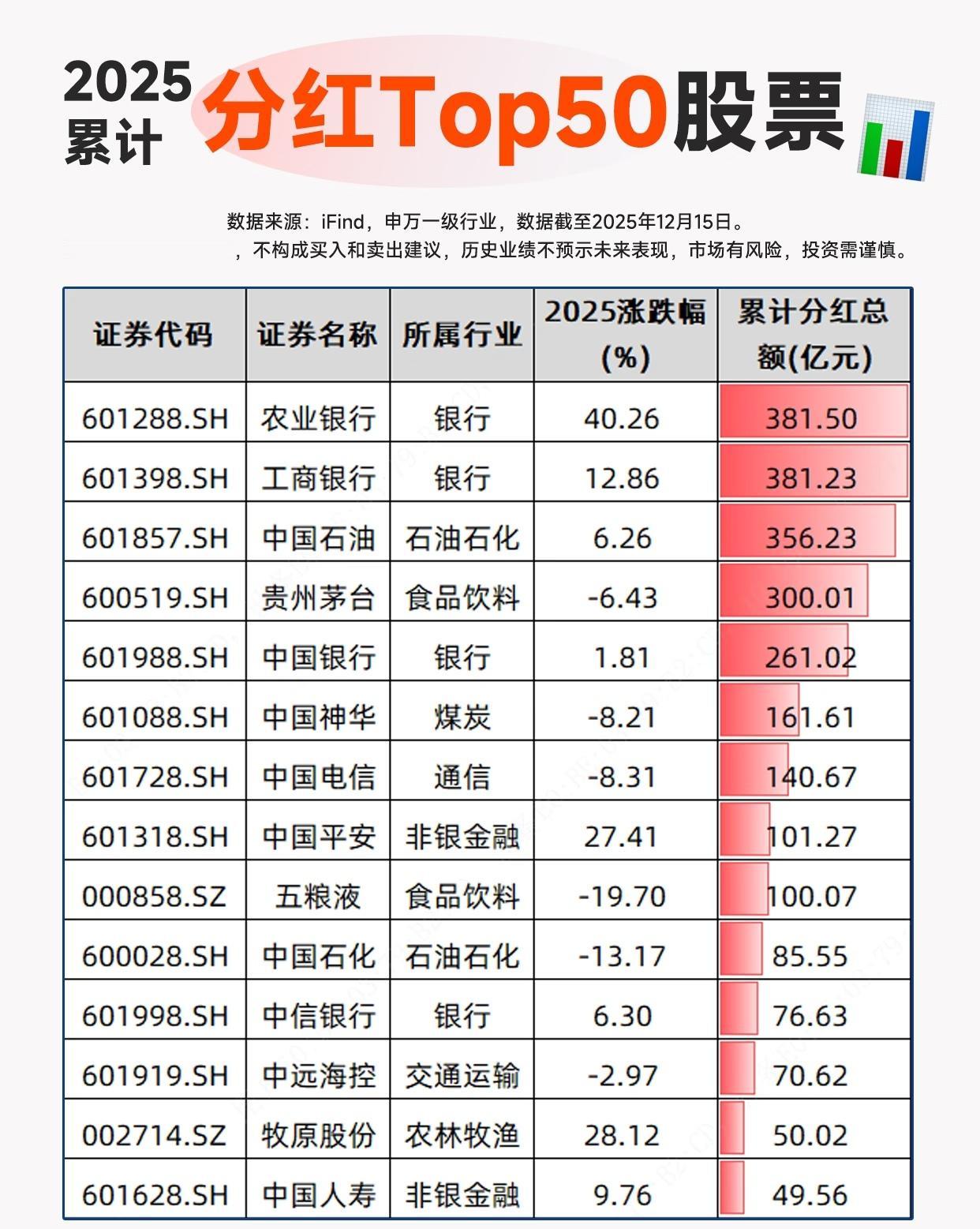 2025年累计分红Top50股票相关数据 数据来源为iFind及申万一级行业,截至2025年12月15日,且均提示内容仅作案例分析,不构成买卖建议,历史业绩不预示未来表现,市场有风险,投资需谨慎。 第一张图聚焦分红总额靠前的头部公司,展示了农业银行(银行,2025涨跌幅40.26%,累计分红381.50亿元)、工商银行(银行,涨跌幅12.86%,分红381.23亿元)、中国石油(石油石化,涨跌幅6.26%,分红356.23亿元)、贵州茅台(食品饮料,涨跌幅-6.43%,分红300.01亿元)等,覆盖银行、石油石化、食品饮料、煤炭、通信、非银金融、农林牧渔等行业。 第二张图延续榜单,列出更多行业标的,包括迈瑞医疗(医药生物,涨跌幅-22.74%,分红49.35亿元)、紫金矿业(有色金属,涨跌幅107.74%,分红45.30亿元)、宁德时代(电力设备,涨跌幅44.92%,分红44.11亿元)、美的集团(家用电器,涨跌幅6.90%,分红34.48亿元)等,行业延伸至医药生物、有色金属、电力设备、计算机、家用电器等领域。 第三张图补充后续标的,涉及沪农商行(银行,涨跌幅7.05%,分红23.24亿元,为该图分红最高)、中国移动(通信,涨跌幅-12.99%,分红22.59亿元)、阳光电源(电力设备,涨跌幅130.53%)、京沪高铁(交通运输,涨跌幅-17.05%)等,覆盖银行、通信、食品饮料、建筑材料、交通运输、传媒、非银金融、基础化工、农林牧渔、石油石化、汽车、公用事业、建筑装饰、家用电器、国防军工等行业,其中阳光电源涨幅显著,京沪高铁跌幅较大。 整体来看,三张图完整呈现了2025年累计分红Top50股票的多维度信息,涵盖不同行业公司的涨跌幅与分红表现,头部公司以银行、石油石化等传统行业为主,后续标的行业分布更分散,且存在涨幅超100%(如紫金矿业、阳光电源)或跌幅较深(如五粮液、京沪高铁)的标的。