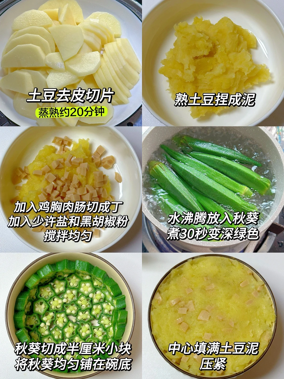 今天给姐妹分享一道减脂~满天星,土豆是优质碳水,秋葵的加入也补充了维生素。这盘才200大卡,饱腹感强,简单好吃😋,减脂期的姐妹们一定要试试哟! 🥗食材:土豆2个、秋葵100g、鸡肉肠、葱花 🥘做法:如图所示(土豆泥比较干可以加入少许牛奶,这样就变成有奶香味的土豆泥了)