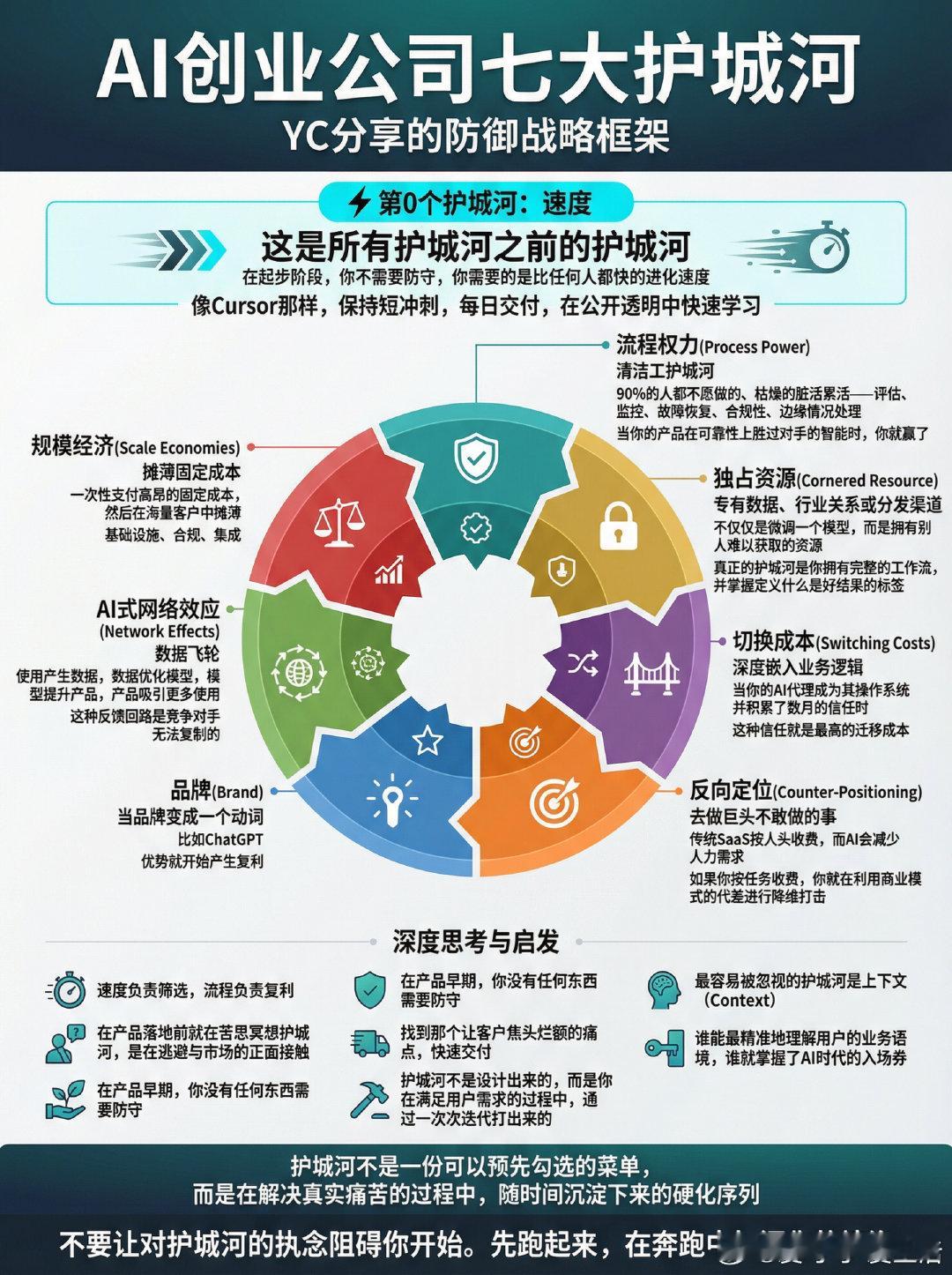 YC分享了AI创业公司的七大护城河。这套理论源自Hamilton Helmer的七大力量,但在AI时代有了全新的演进逻辑。对于开发者和创始人来说,在交付下一个功能前,这套框架值得反复研读。第0个护城河:速度。这是所有护城河之前的护城河。在起步阶段,你不需要防守,你需要的是比任何人都快的进化速度。像Cursor那样,保持短冲刺,每日交付,在公开透明中快速学习。1. 流程权力(Process Power)这也被称为清洁工护城河。那些90%的人都不愿做的、枯燥的脏活累活——评估、监控、故障恢复、合规性、边缘情况处理。当你的产品在可靠性上胜过对手的智能时,你就赢了。企业级产品的竞争,本质上是可靠性的竞争。2. 独占资源(Cornered Resource)这不仅仅是微调一个模型,而是拥有别人难以获取的专有数据、行业关系或分发渠道。真正的护城河是你拥有完整的工作流,并且掌握定义什么是好结果的标签。3. 切换成本(Switching Costs)虽然AI代理让数据迁移变得容易,但它也建立了新的壁垒。当你的AI代理深度嵌入客户的业务逻辑,成为其操作系统并积累了数月的信任时,这种信任就是最高的迁移成本。4. 反向定位(Counter-Positioning)去做现有的巨头不敢做的事。例如,传统SaaS按人头收费,而AI会减少人力需求,这会摧毁巨头的营收模型。如果你按任务收费,你就在利用商业模式的代差进行降维打击。5. 品牌(Brand)当品牌变成一个动词,比如ChatGPT,优势就开始产生复利。在产品同质化时,客户依然选择你,这就是品牌护城河。6. AI式网络效应(Network Effects)这不再是社交关系网,而是数据飞轮:使用产生数据,数据优化模型,模型提升产品,产品吸引更多使用。这种反馈回路是竞争对手无法通过单纯增加算力来复制的。7. 规模经济(Scale Economies)一次性支付高昂的固定成本(如基础设施、合规、集成),然后在海量客户中摊薄。深度思考与启发:护城河不是一份可以预先勾选的菜单,而是在解决真实痛苦的过程中,随时间沉淀下来的硬化序列。速度负责筛选,流程负责复利。如果你在产品落地前就在苦思冥想护城河,那你其实是在逃避与市场的正面接触。在产品早期,你没有任何东西需要防守。找到那个让客户焦头烂额的痛点,快速交付。护城河不是设计出来的,而是你在满足用户需求的过程中,通过一次次迭代打出来的。最容易被忽视的护城河是上下文(Context)。谁能最精准地理解用户的业务语境,谁就掌握了AI时代的入场券。不要让对护城河的执念阻碍你开始。先跑起来,在奔跑中加深你的壕沟。x.com/guilleflorvs/status/2001274089244168567