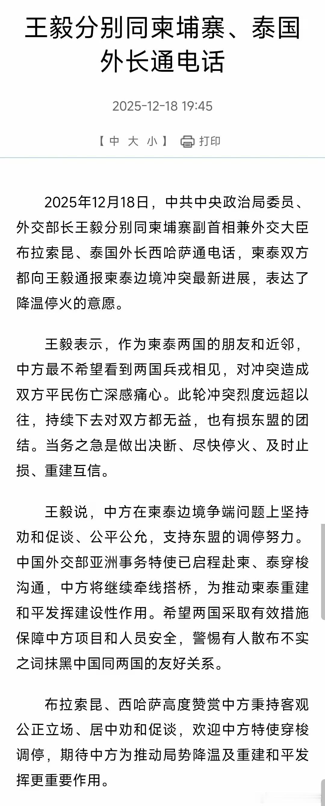 中方穿梭调停显担当 泰柬冲突迎和平曙光12月18日,中国外交部特使启程赴柬泰开展穿梭外交,王毅外长同步与两国外长通话斡旋,柬泰双方均赞赏中方公正立场,明确表达降温停火意愿,欢迎中方居中调停,为外交解决冲突迈出关键一步。持续超10天的泰柬边境冲突烈度远超以往,已造成数十人丧生,超43万柬埔寨民众、26万泰国民众流离失所,中方介入为苦难中的民众带来和平希望。与外部势力调停形成鲜明对比,特朗普12日高调宣称促成泰柬停火,随即遭泰方公开否认,东盟相关倡议也未获认可。而中方调停始终秉持务实高效策略:精准把握泰方17日释放的停火信号,次日即刻启动穿梭外交;坚持“先建机制再谈和平”,早在8月就推动柬泰外长“安宁茶叙”,倡导建立停火监督机制;更愿提供边境扫雷等实质支持,而非短期交易式斡旋。这种尊重主权、兼顾长远的调停方式,正是中方赢得双方信任的核心原因。中方调停彰显大国担当,也践行了全球安全倡议的核心要义。愿柬泰双方珍惜此次契机,在中方助力下早日停火止战,让边境民众重归安宁,这份和平也将成为最珍贵的新年馈赠。中方赴泰柬穿梭调停意味着什么