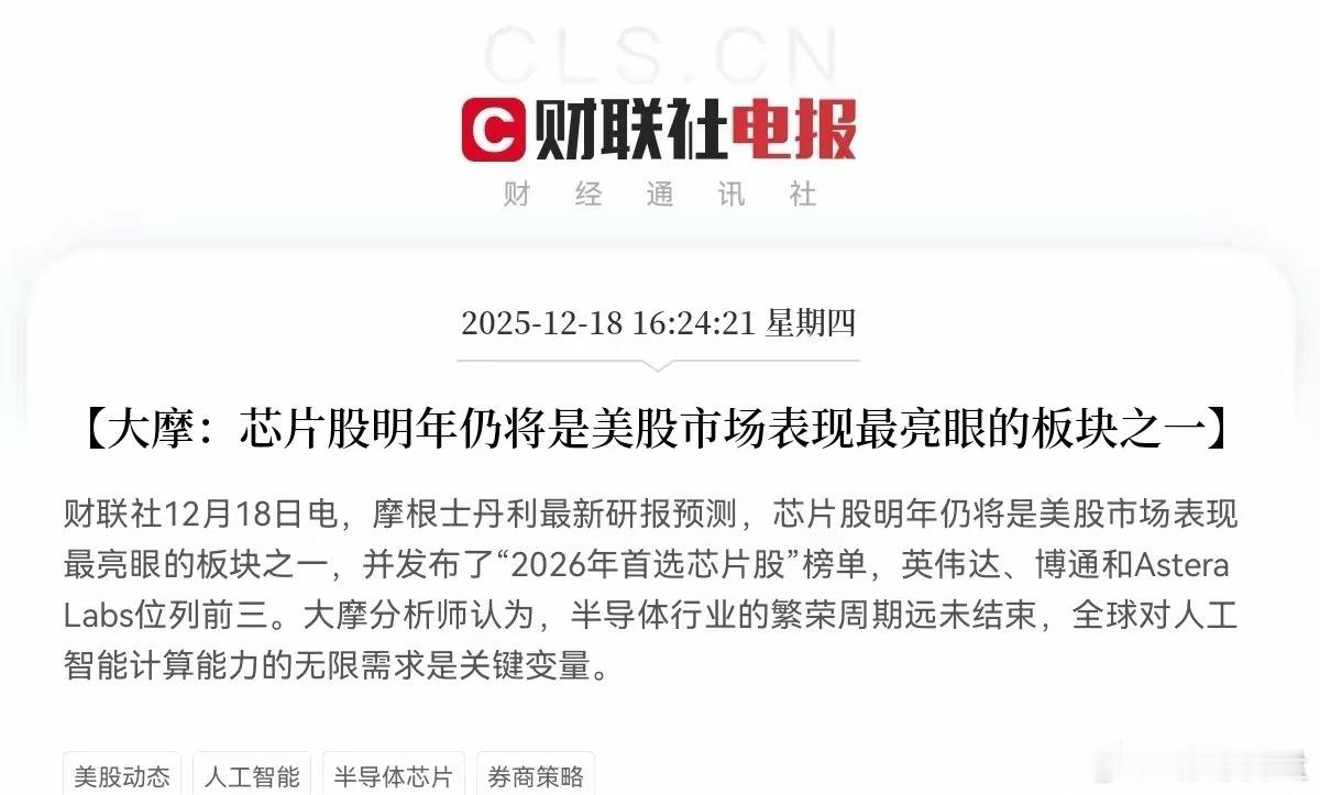 存储芯片又要起飞了!就在刚刚!大摩发布最新利好观点!不出意外的话,明日存储芯片板块要继续火力全开了,满仓这个方向的,准备大口大口吃肉吧…下午4点24分,摩根士丹利发布最新研报预测称,芯片股明年仍将是美股市场表现最亮眼的板块之一,并且认为半导体行业的繁荣周期远未结束!大摩观点一发出,股民们又兴奋起来了,这篇研报对于半导体芯片行业就是火上浇油,短期将是存储芯片的催化剂,半导体芯片是科技革命,人工智能时代的核心基石,随着人工智能的蓬勃发展,半导体芯片行业的许多优质公司依旧还会有较大的增长空间,长期向好的趋势没有改变,不出意外的话,全球资本依旧会疯狂拥抱人工智能,AI,半导体芯片等科技赛道,预计大摩的预测成真的可能性很大,半导体芯片行情有望延续到明年!股民们!坐稳扶好!受此消息刺激,预计明日存储芯片概念股要大爆发了,2026年半导体芯片有望继续领跑!