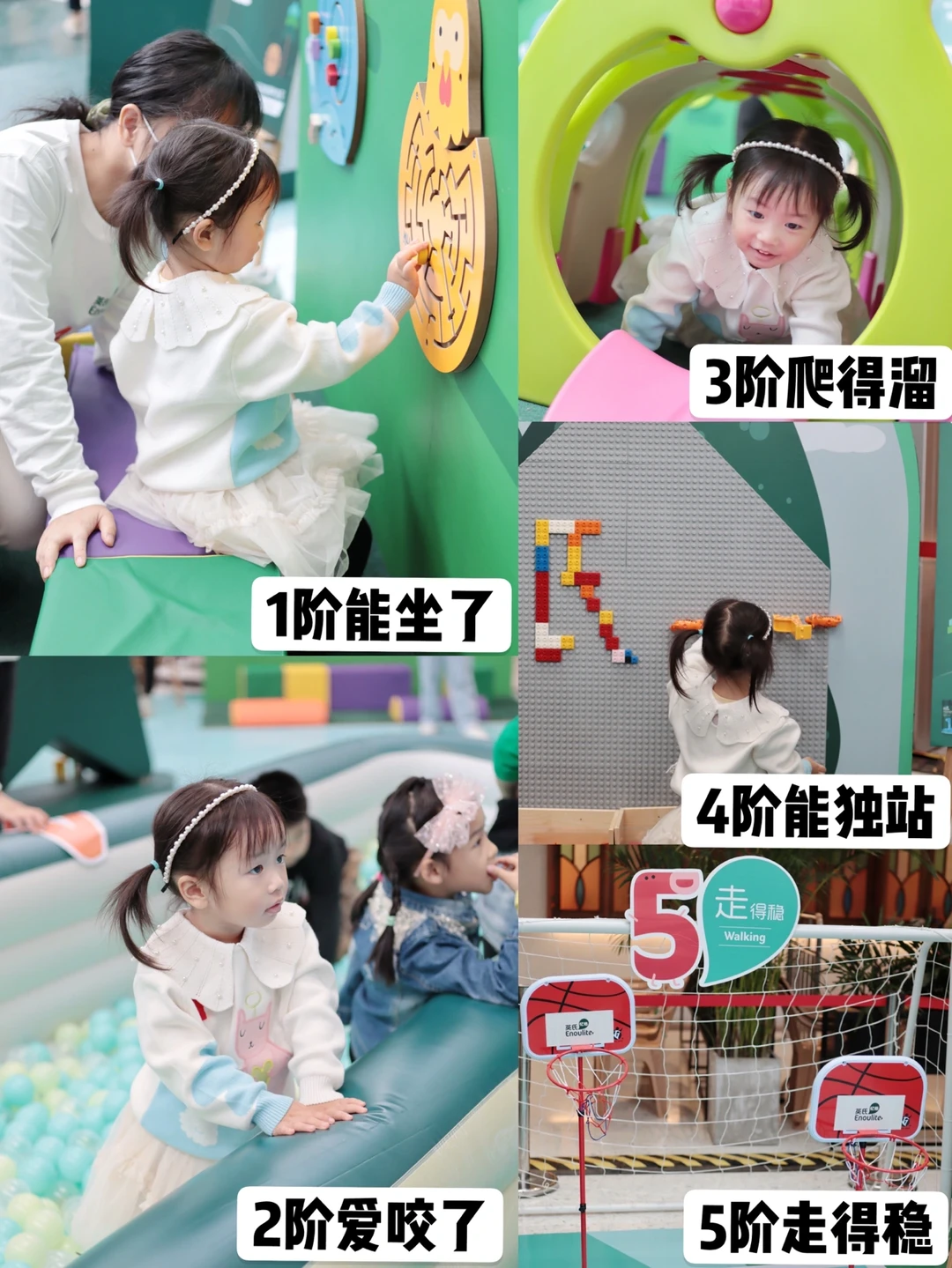 不过这可不是真的游乐场,玩法不一样哦~现场根据孩子5⃣️个阶段设置了5⃣️个小关卡,也就是他们的5阶,1⃣️阶能坐了是坐着玩玩具,2⃣️阶爱咬了是在海洋球池里玩耍,3⃣️阶爬🉐️溜锻炼宝宝爬行能力,4⃣️阶能独站自己玩积木墙,5⃣️阶走得稳可以自己投篮🏀啦,全部通过了就可以得到超多赠品🎁,宝宝辅食和辅食分阶手册就可以带回家啦✌🏻