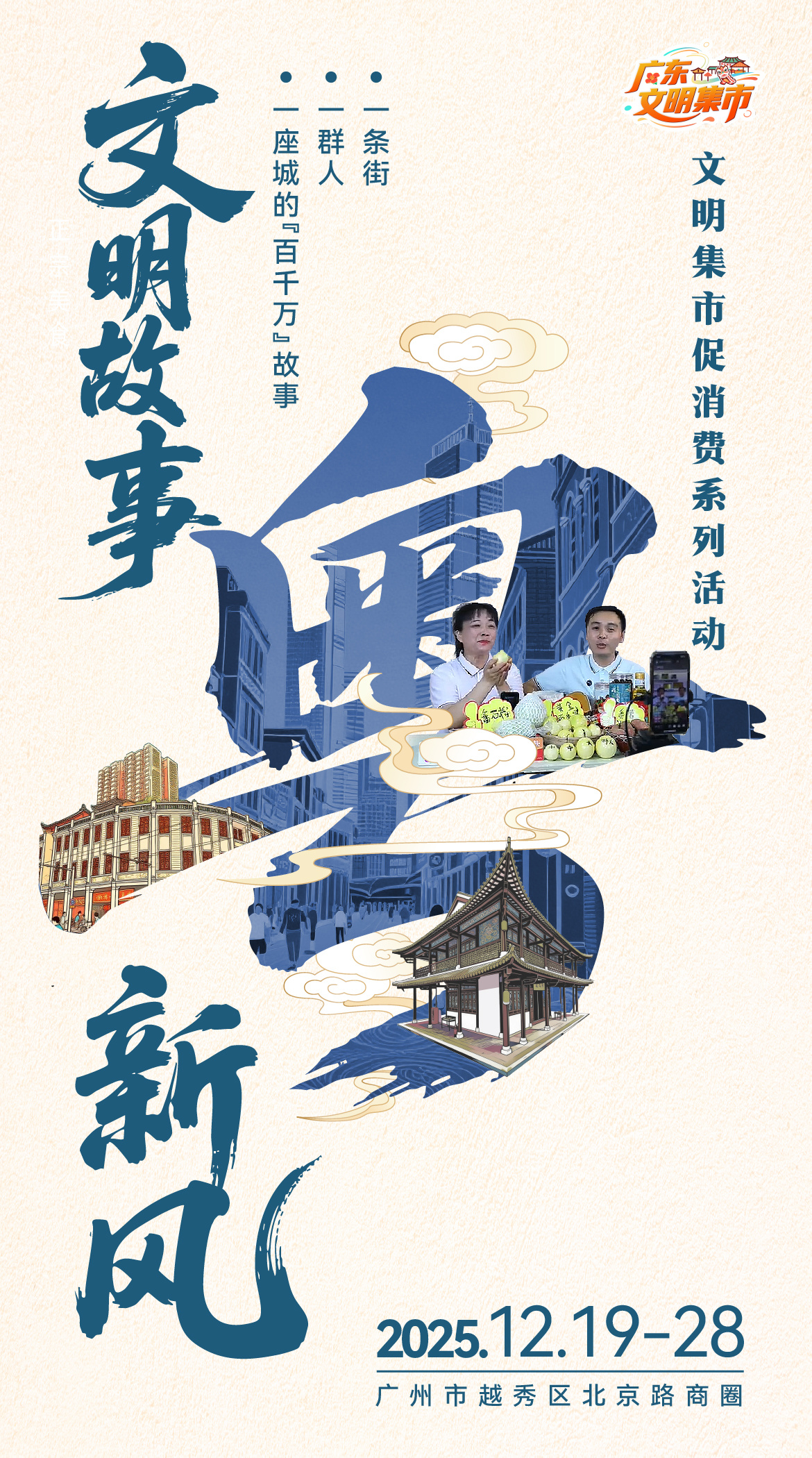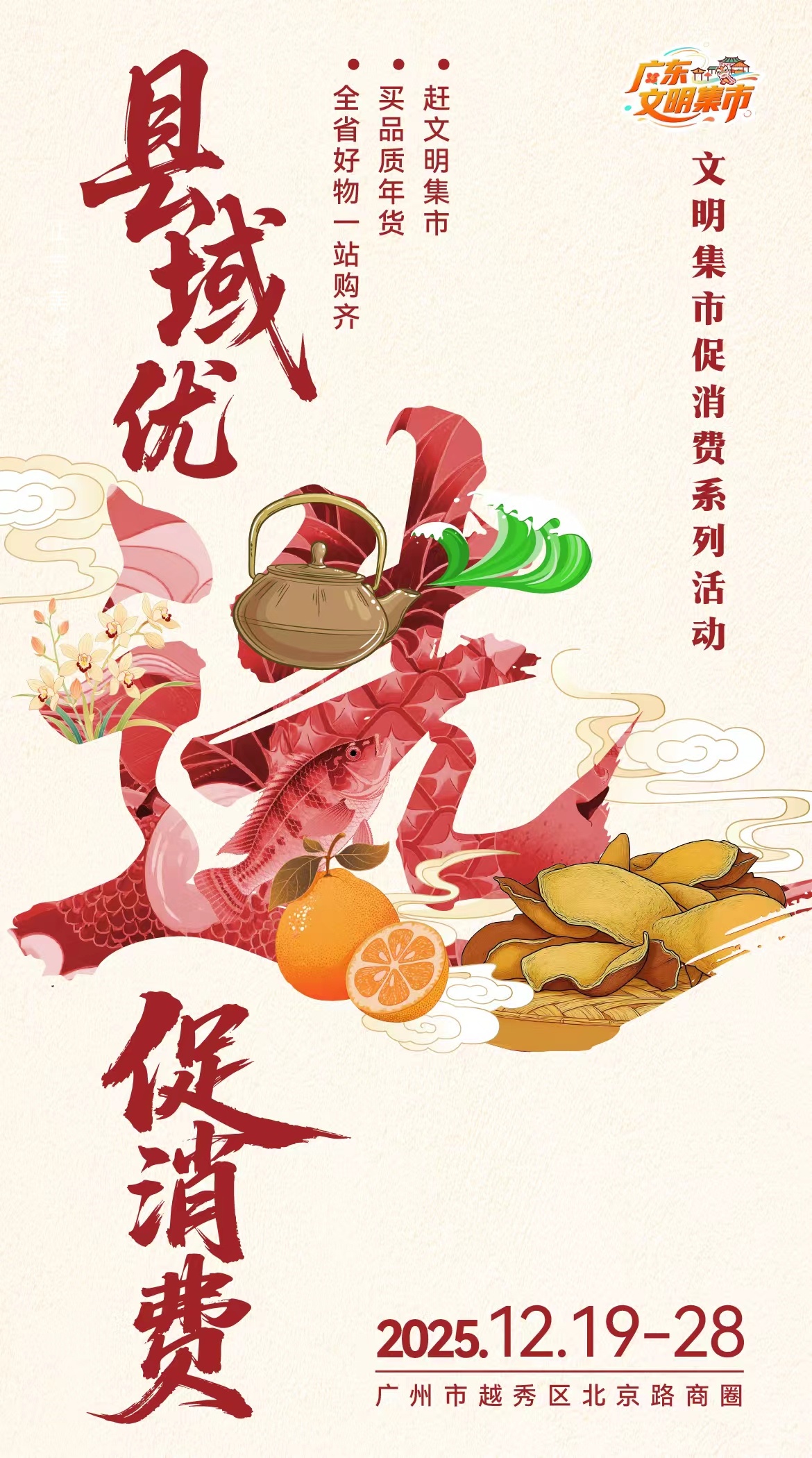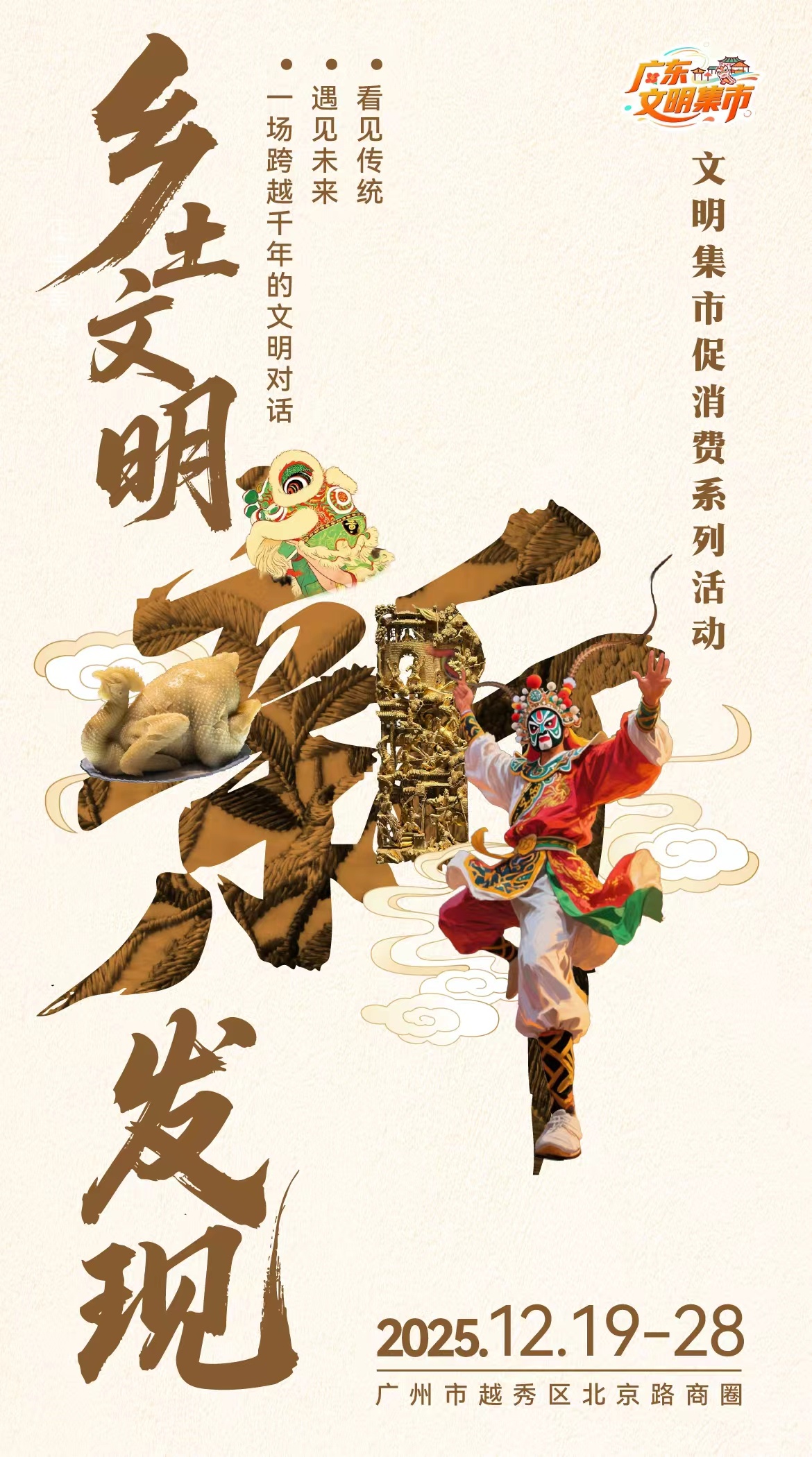 ‼️北京路文明大集12.19开市 | 逛千年商街淘全省好物岁末年味浓!12月19日-28日,北京路文明集市促消费活动火热开市,千年广府商街化身岭南好物聚集地,带你一站式逛遍21个县(市、区)的农产、非遗、文创!✅ 逛吃买攻略:综合展区淘兴宁鸽、绿棋楠沉香木,南药茶专区品英德红茶、新会陈皮,同庆坊“寻味岭南”美食汇+广州酒家限定套餐,舌尖畅游岭南;更有珠江游船“流动文明集市”,解锁水上赶集新体验!✅ 文化盛宴:普宁英歌舞、高州木偶戏、陆丰皮影戏轮番展演,龙门农民画旗袍秀动态演绎乡土美学,广百门前还能体验技工院校文创、粤菜师傅现烹美味!✅ 惠民福利:直播间线下引流助农,展区满减券任性领;冬至专题活动暖心上线,中医义诊、防诈科普、红色电影等便民服务同步开启!启动仪式12.19日天河城南广场见,首发《北京路文脉地图》带你精准打卡!赶一场有文化、有温度的大集,助力“百千万工程”,就在北京路~粤享暖冬乐游广东 北京路文明大集粤分享粤精彩