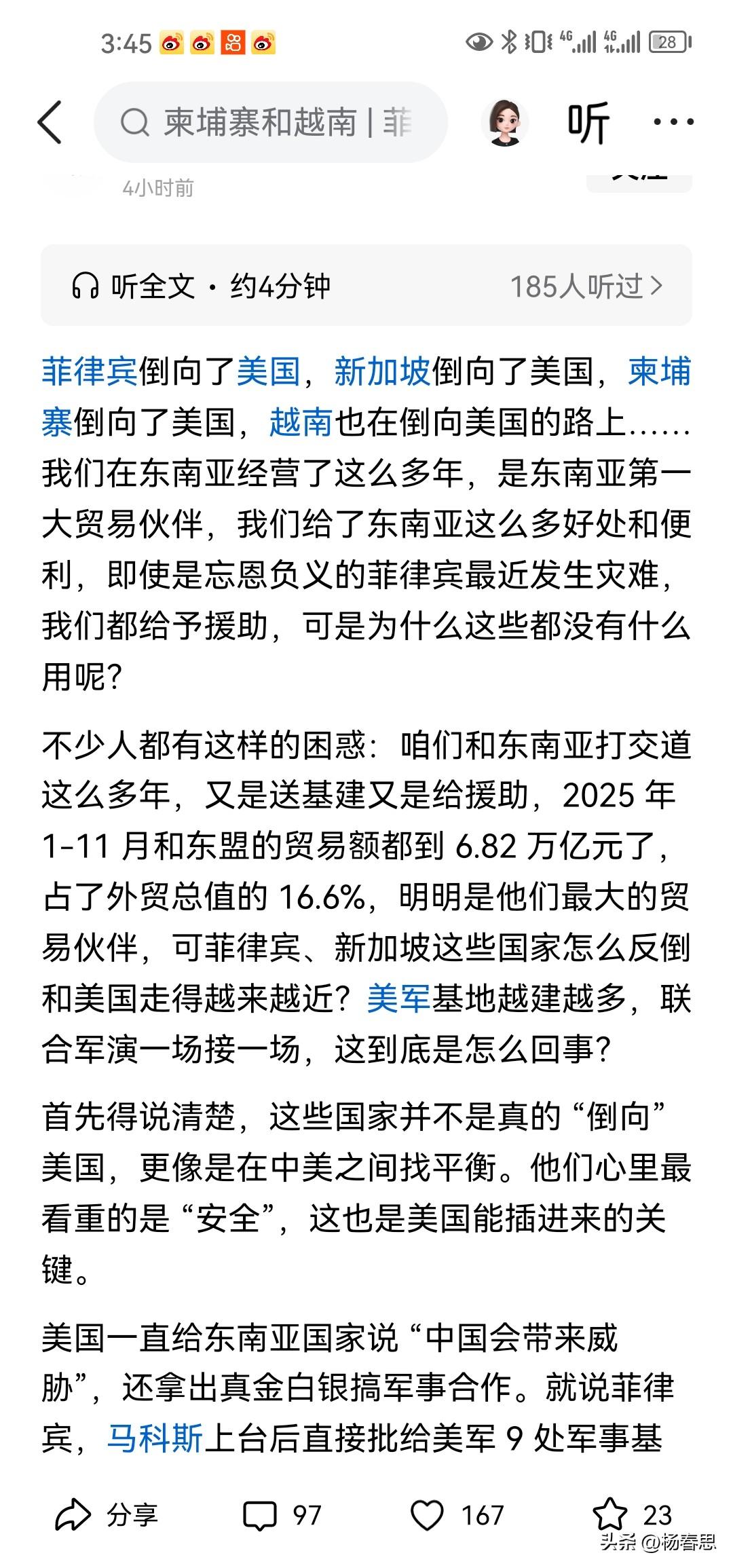 其实这个问题也不应该出现的是吧?都说美国在衰落,中国在崛起,中国有钱。有武器。有实力,为什么放出这么多恩惠出去,但东南亚还是摇摆不定,更大程度倒向美国。我们就应该反思一下是恩威没有并用,恩多了威却没有,中国给他们太多胡萝卜,还不如美国的一根大棒。美国一些东西还是需要学习。