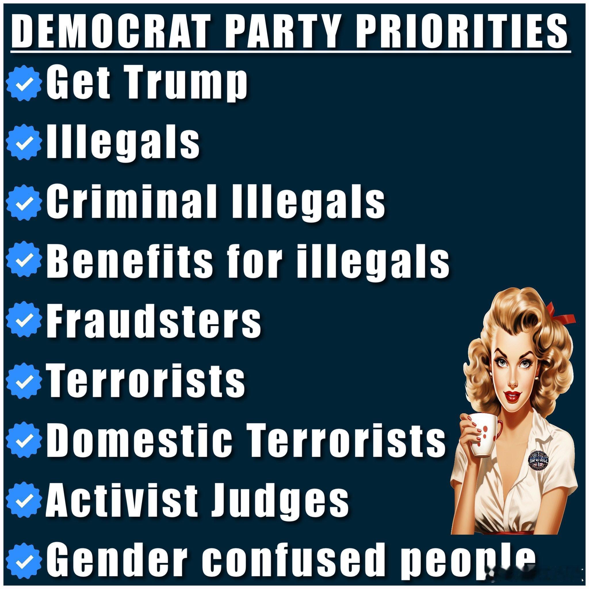 美国民左党优先事项:✓ 抓住特朗普✓ 非法移民✓ 犯罪非法移民✓ 为非法移民提供福利✓ 欺诈者✓ 恐布分子✓ 国内恐布分子✓ 激进法官✓ 性别困惑的人