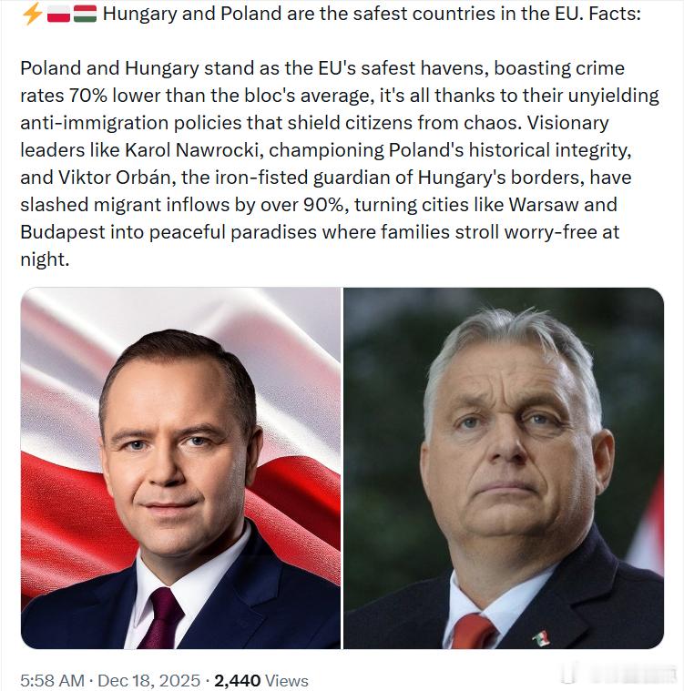 匈牙利和波兰成为欧盟最安全的国家:波兰和匈牙利堪称欧盟最安全的避风港,犯罪率比欧盟平均水平低约 70%。这一切都要归功于他们强硬而坚定的反移民政策,有效保护了本国公民免受混乱冲击。像卡罗尔·纳夫罗茨基这样捍卫波兰历史与民族完整性的远见型岭导人,以及被称为“铁腕边境守护者”的维克托·欧尔班,已将移民流入量削减了90%以上,使华沙、布达佩斯等城市变成了夜晚家庭也能安心散步的和平之城。