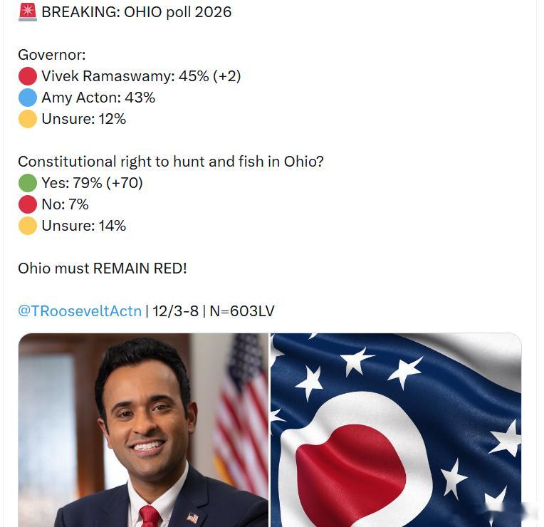 俄亥俄州2026年民调州长选举:🔴 维韦克·拉马斯瓦米:45%(领先2个百分点)🔵 艾米·阿克顿:43%🟡 未决定:12%是否将“狩猎和捕鱼”确立为俄亥俄州的宪法权利?🟢 是:79%(+70)🔴 否:7%🟡 未决定:14%