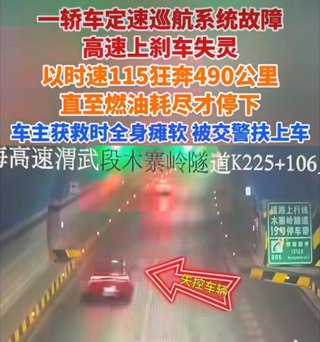 轿车刹车失灵以时速115狂奔490公里时速115,没有人员伤亡,没有车辆碰撞,这已经很强了,还好报警及时有救援,不然都不用等燃油燃尽