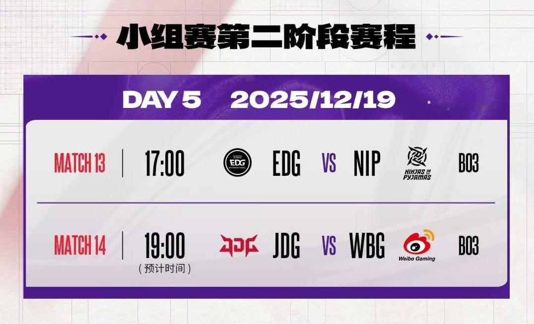 【2025德玛西亚杯|第二阶段赛程】第二阶段小组赛分组A组:IG,EDG,NIP,WE,LGDB组:BLG,JDG,WBG,LNG,OMG今日赛程如下jdg将面对blg