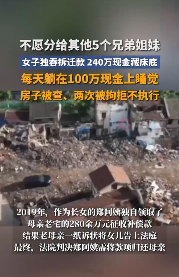 看了 上海阿姨独吞6兄弟姐妹同属拆迁款 报道,这家中长姐是真的太恶劣:先是抢了母亲的拆迁款,母亲起诉她成功钱没拿到就病逝了,等于没享受到这笔钱反而被气得不行就走了…然后她又拒不分给兄弟姐妹,最后是法院强执在床底下找到了钱,这家伙天天睡在钱上面…她的罪恶链条很清晰:从侵占母亲财产开始,到对抗法律判决,最后利用家人的亲情为自己减责减免债务。这不仅是贪财,更是对法律与亲情的双重背叛。这样的人,最后还得到了一个好结果,没受到刑罚加身,所以社会面上蛮不讲理的人越来越多,老赖也越来也多…其实应该判刑。热点观点