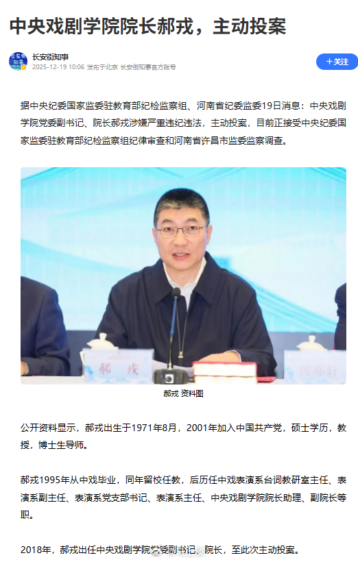 中戏院长郝戎主动投案接受审查调查。其曾强调“要学演戏,先学做人,做艺先做人。”可