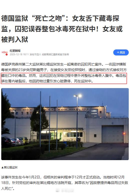 德国女子舌下藏毒探监毒死男友 这吻有毒…你看,毒品的成瘾性多大,关在监狱都戒不了毒,复吸率一直是高的吓人。所以,我们要做的是严厉阻止首次触毒!