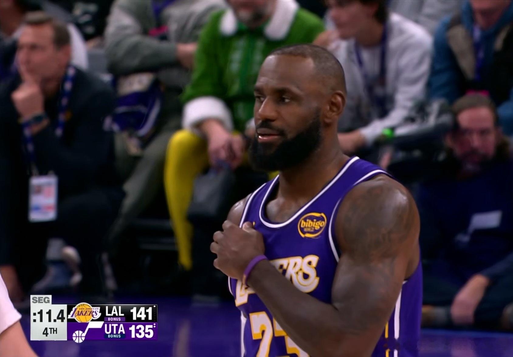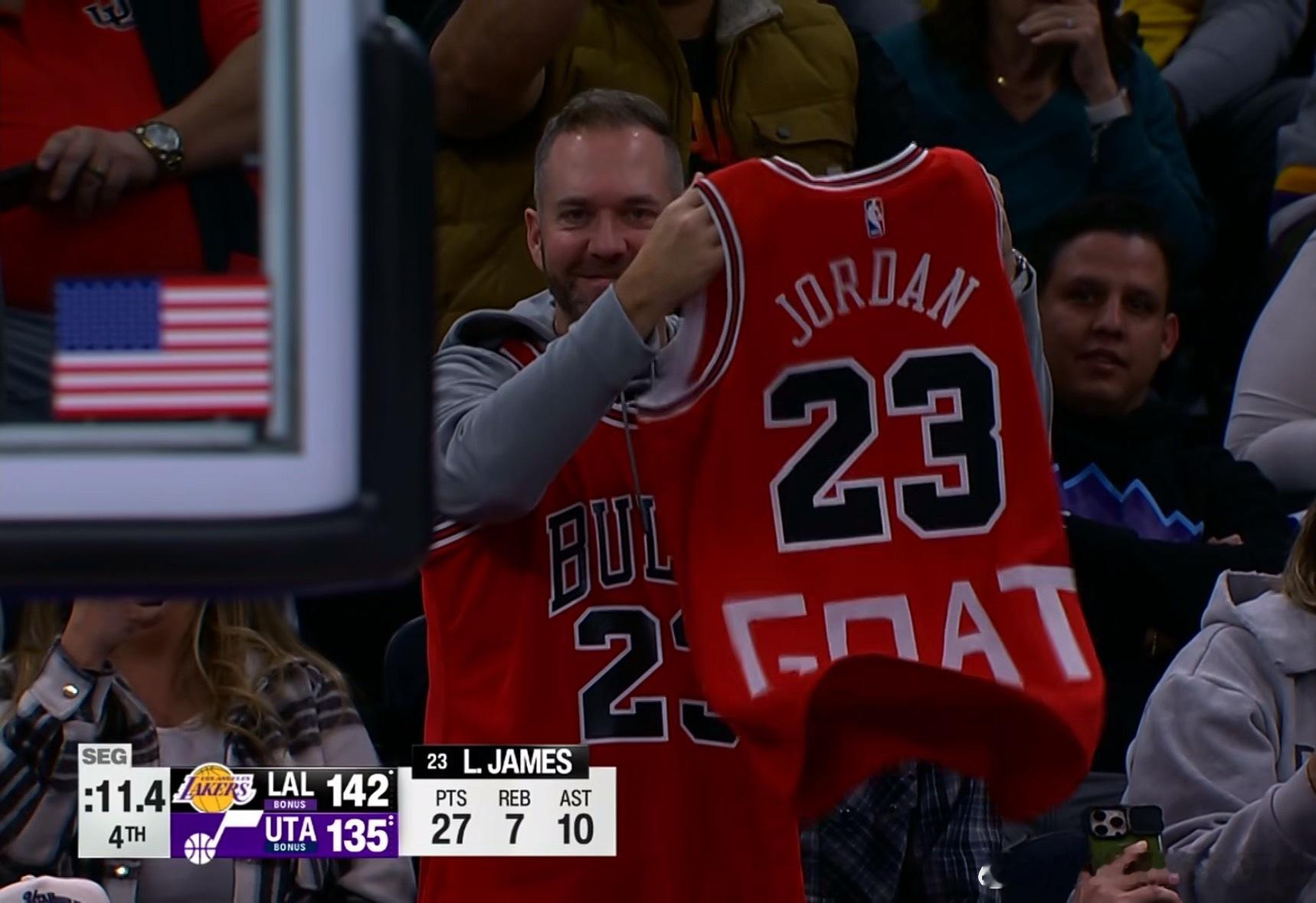 又是一个名场面——詹姆斯罚球时,爵士球迷拿出了印有 GOAT 字样的乔丹球衣!