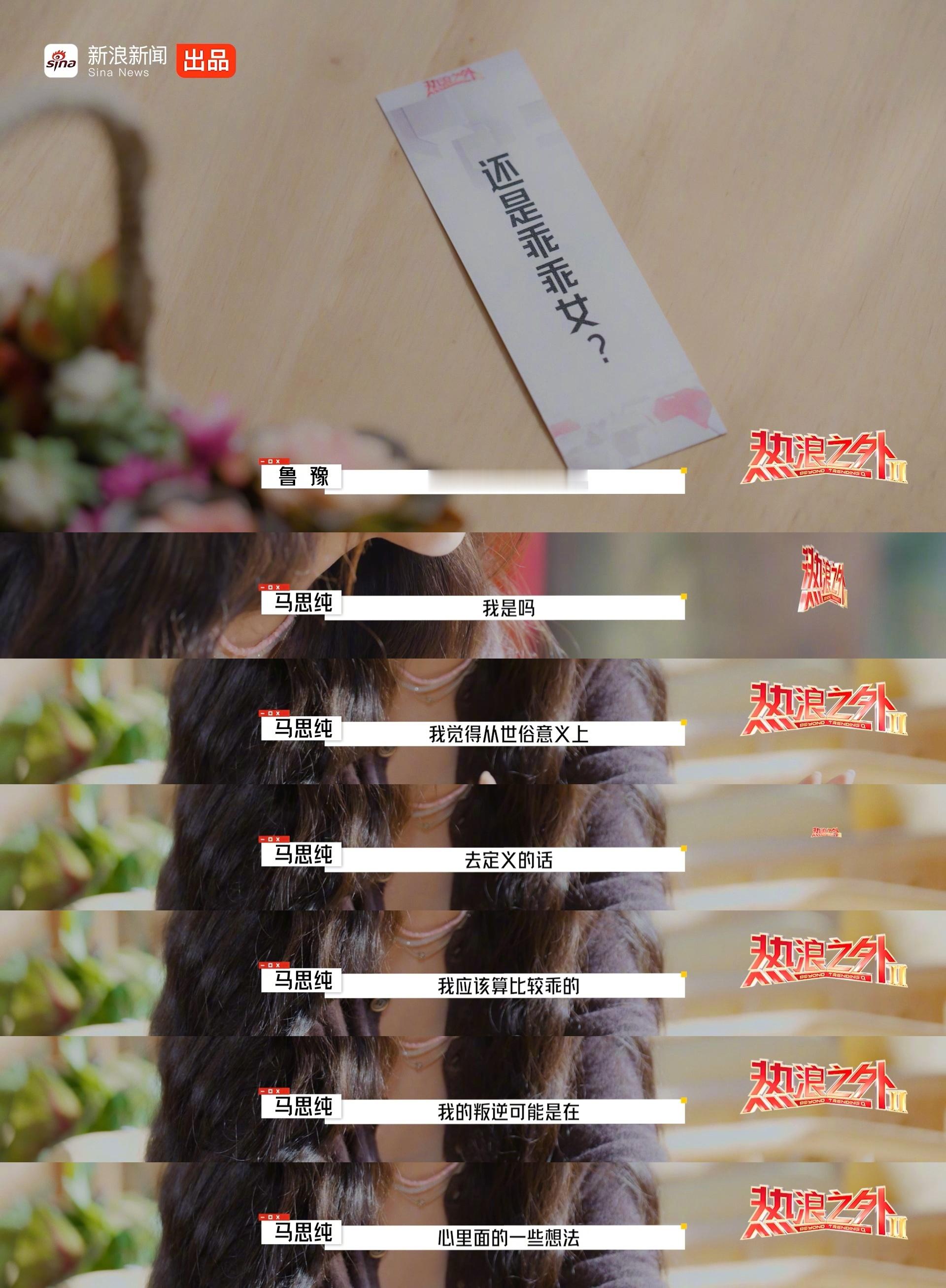 在《热浪之外》,被问到是否是乖乖女?马思纯坦言,从世俗意义上来讲,她是一个乖乖女。她的叛逆更多的是在心里的一些想法。马思纯3岁就知道女人要独立