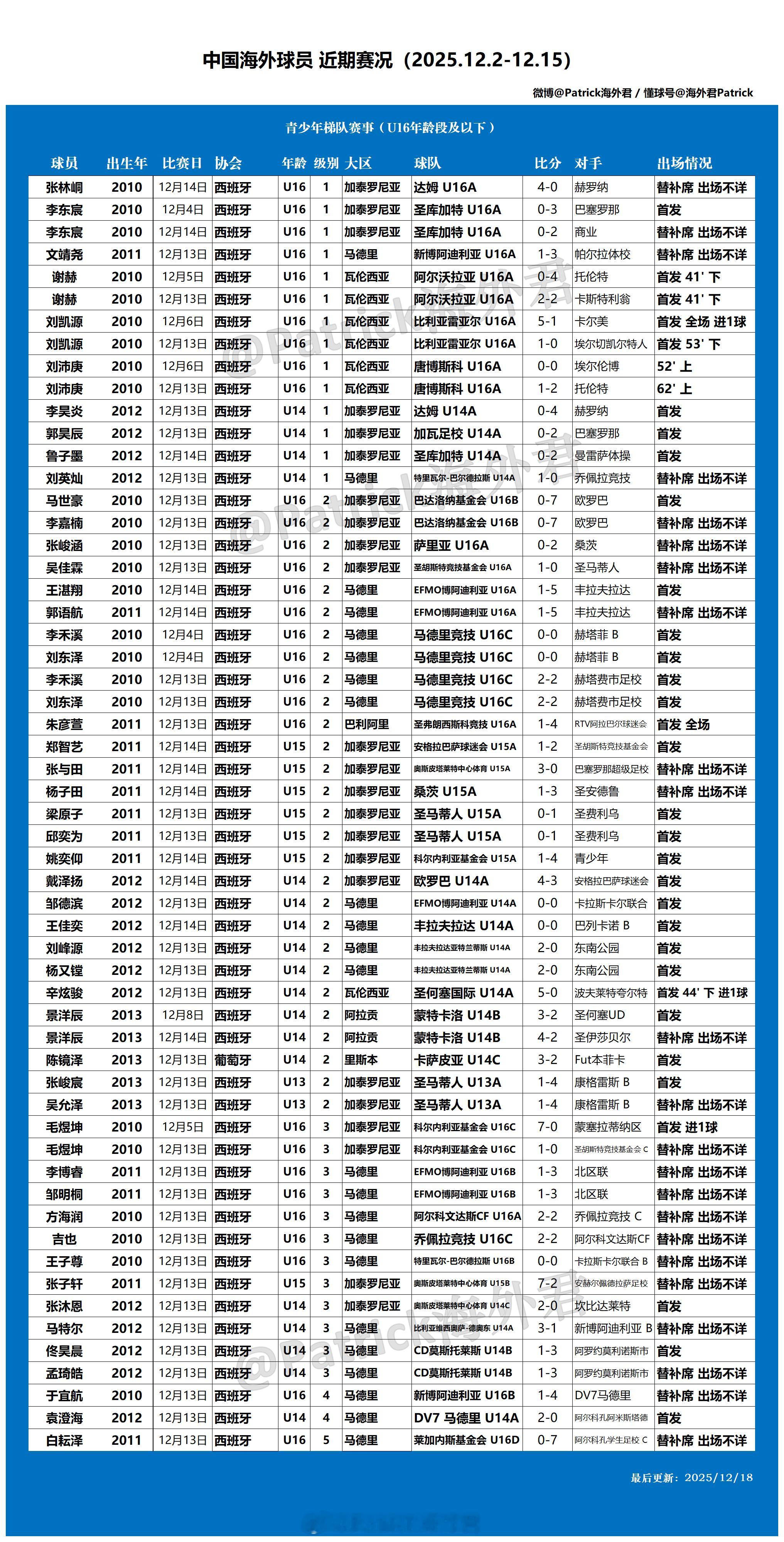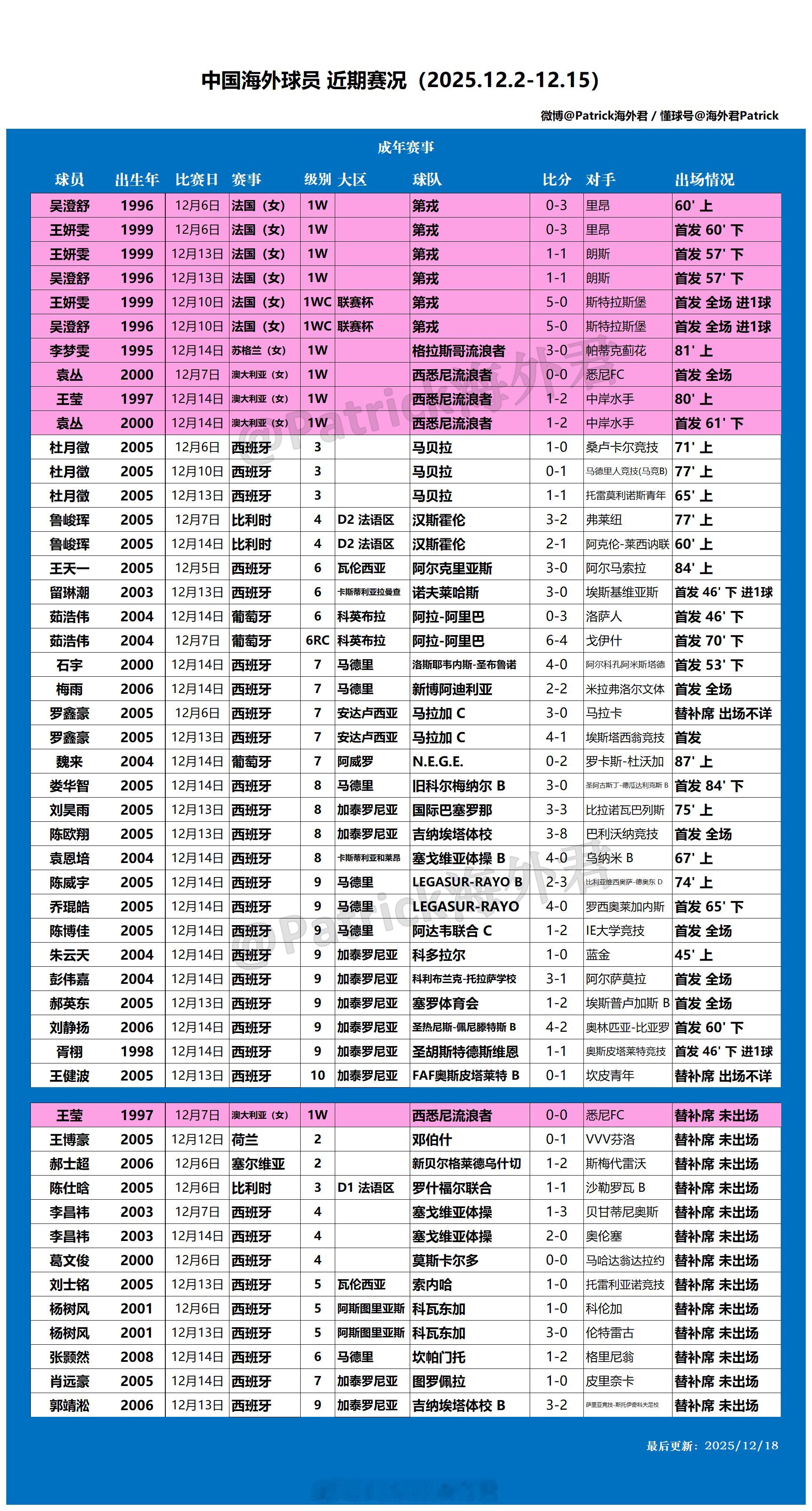 留洋周报海外球员比赛一览(2025年12月2日-12月15日)