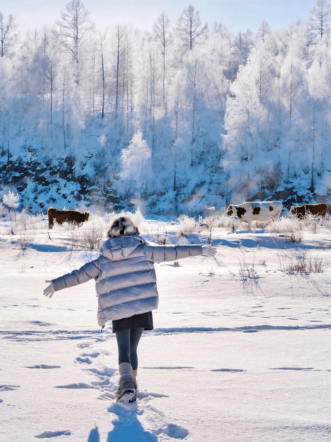 1️⃣没去过东北的可以看一下我的穿衣厚度:上半身要穿300g充绒羽绒服,下半身要穿600D厚的袜子或羽绒裤+牛仔裤,鞋子要穿防滑保暖的雪地靴