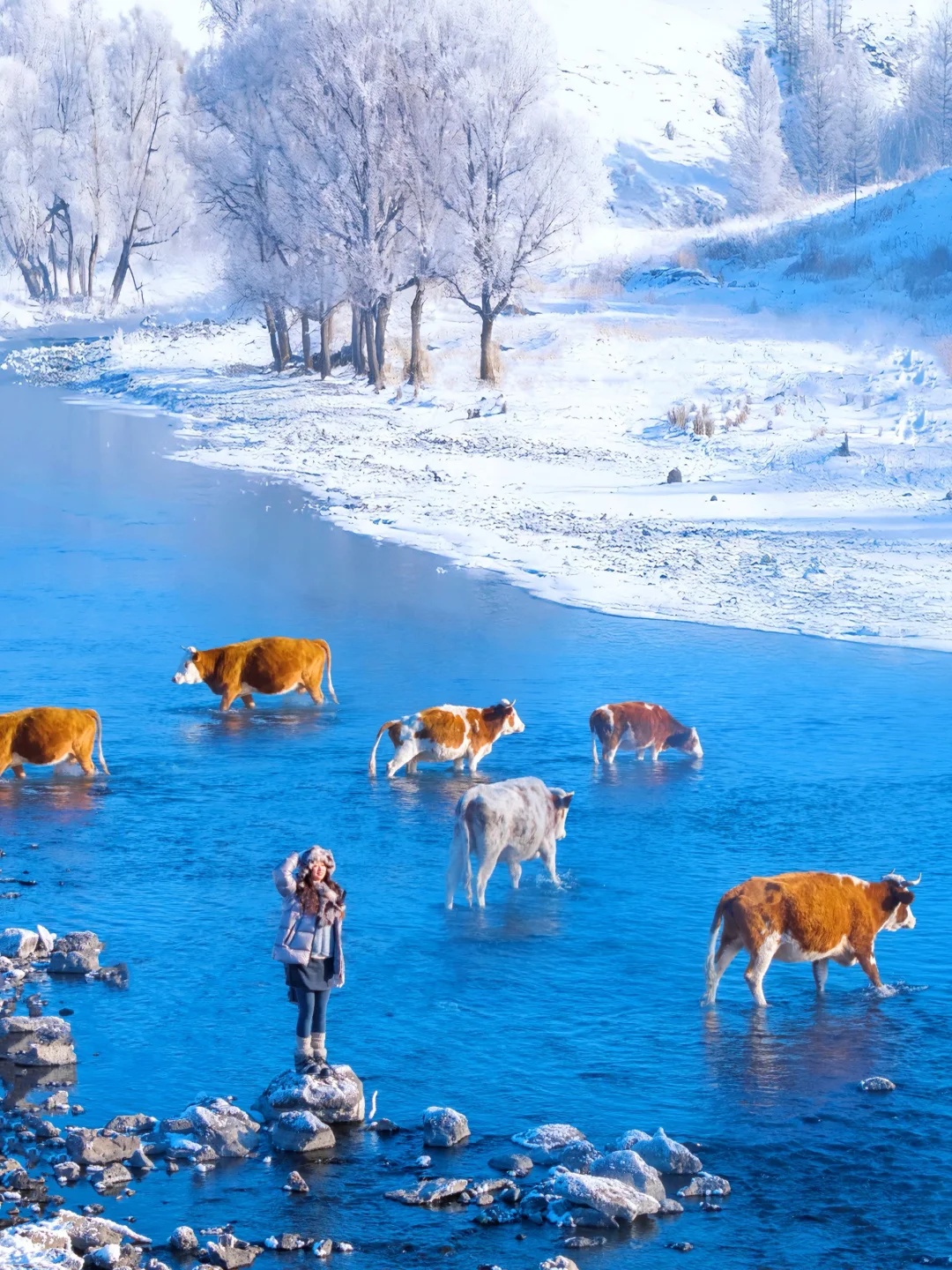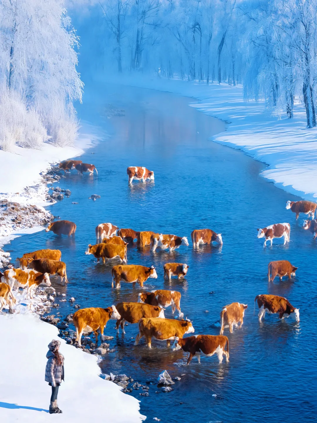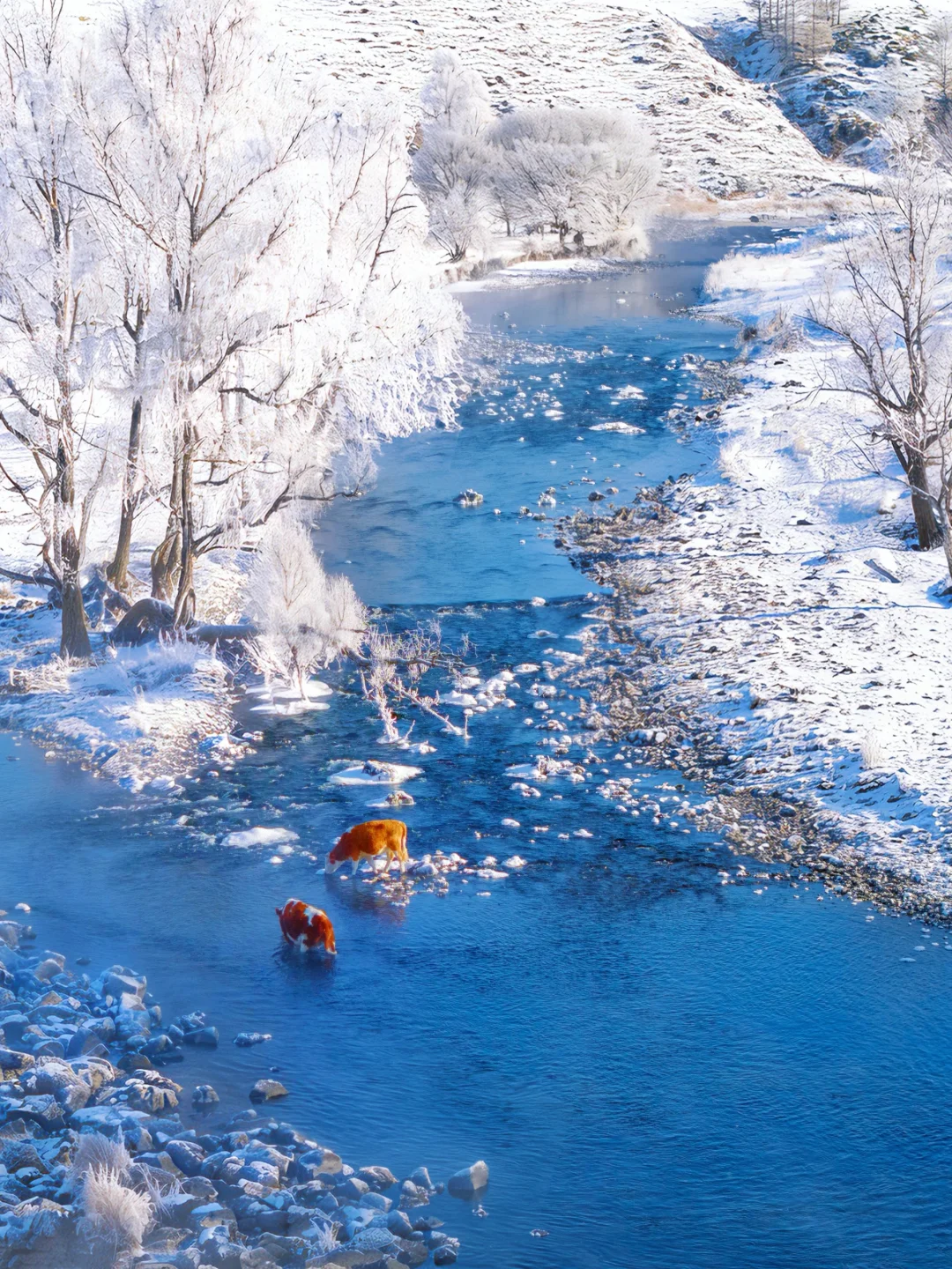 莫日格勒河已经冰封,一整条冰面蜿蜒卧在雪原上,好震撼啊