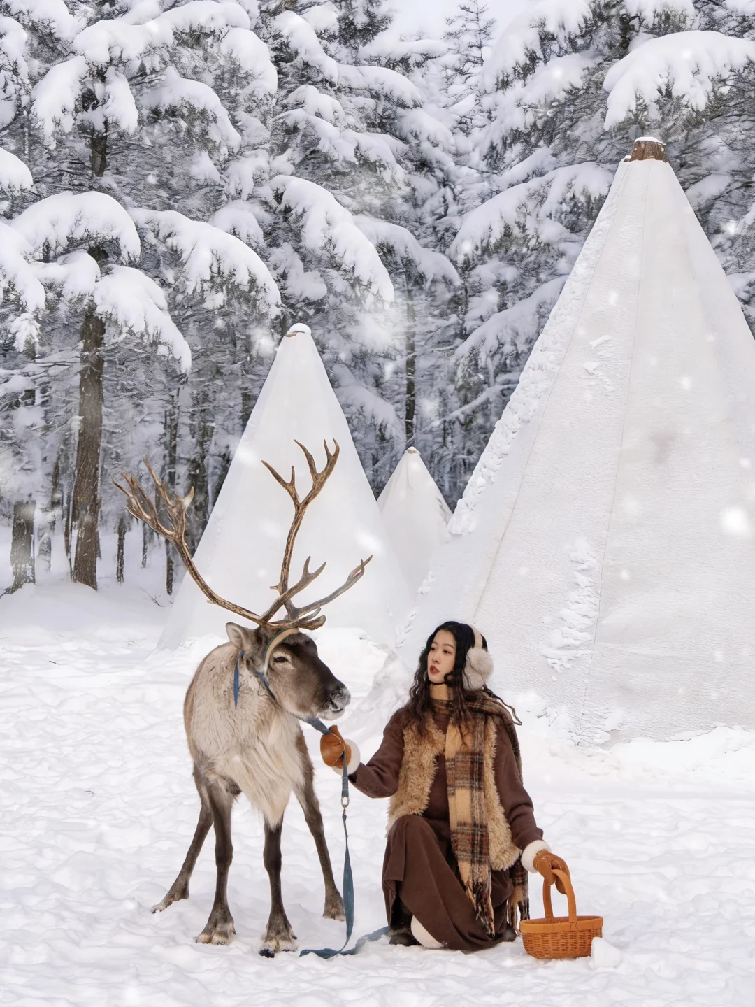 这里有着古老的驯鹿,好多只就这么静静的卧在雪地里,牵一头站在撮罗子前拍照好看!