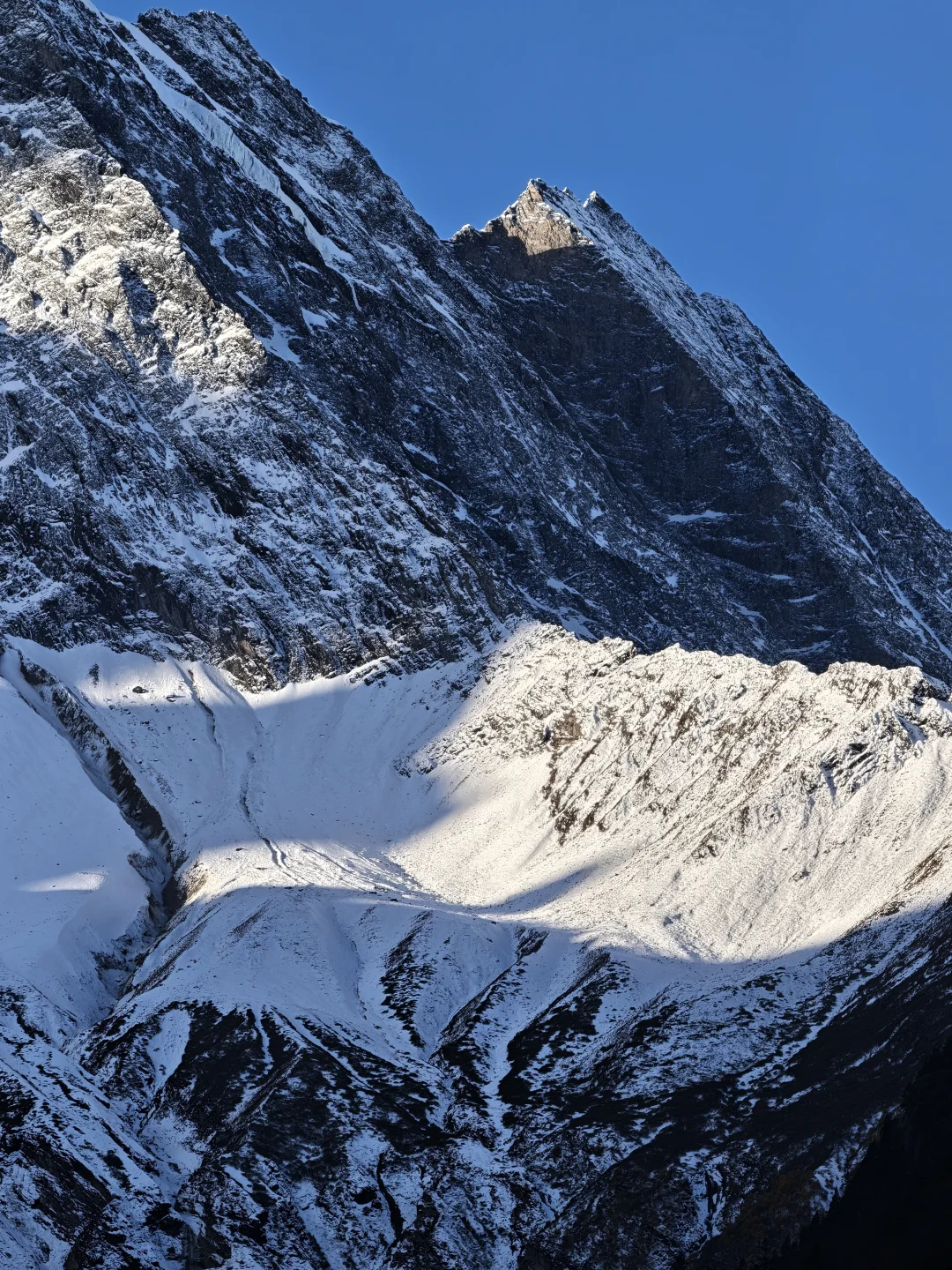 下山时暮色渐合,雪山峰顶染上最后一抹金