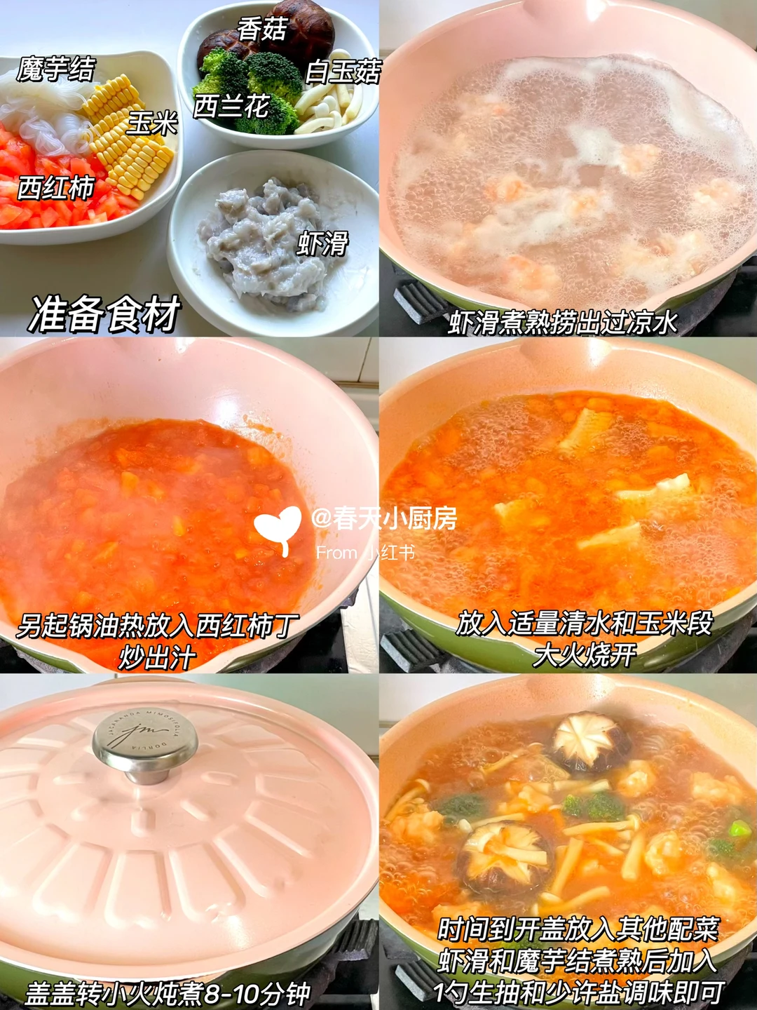 虾滑、西红柿、玉米、西兰花、香菇、白玉菇、魔芋结,调味只需要1勺生抽、少许盐和适量食用油,清水适量