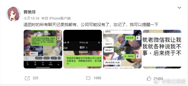 【#曾艳芬曝聊天记录#】#鞠婧祎风波后首现身# 近日,与演员之间合约争议再升级,双方都发布律师声明“以证清白”,其中各种细节引发网友讨论。前队友也发多篇博文力挺鞠婧祎。12月19日,曾艳芬再发文,晒出与丝芭“叶总”的聊天记录,并表示:“退团时的所有聊天记录我都有,公司可能没有了,忘记了,我可以提醒一下”。天眼查工商信息显示,上海丝芭文化传媒集团有限公司成立于2010年5月,法定代表人为王靖,注册资本约8927万人民币,经营范围包括营业性演出、演出经纪、广播电视节目制作经营等。 #曾艳芬提醒丝芭传媒有聊天记录# (白鹿视频)