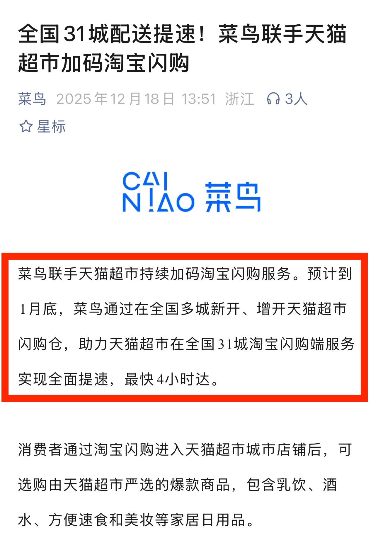 但是阿里生态出手,就是敢说三个月内给淘宝闪购在30多个城市开仓,仓储配送一体到位,全力进驻淘宝闪购。