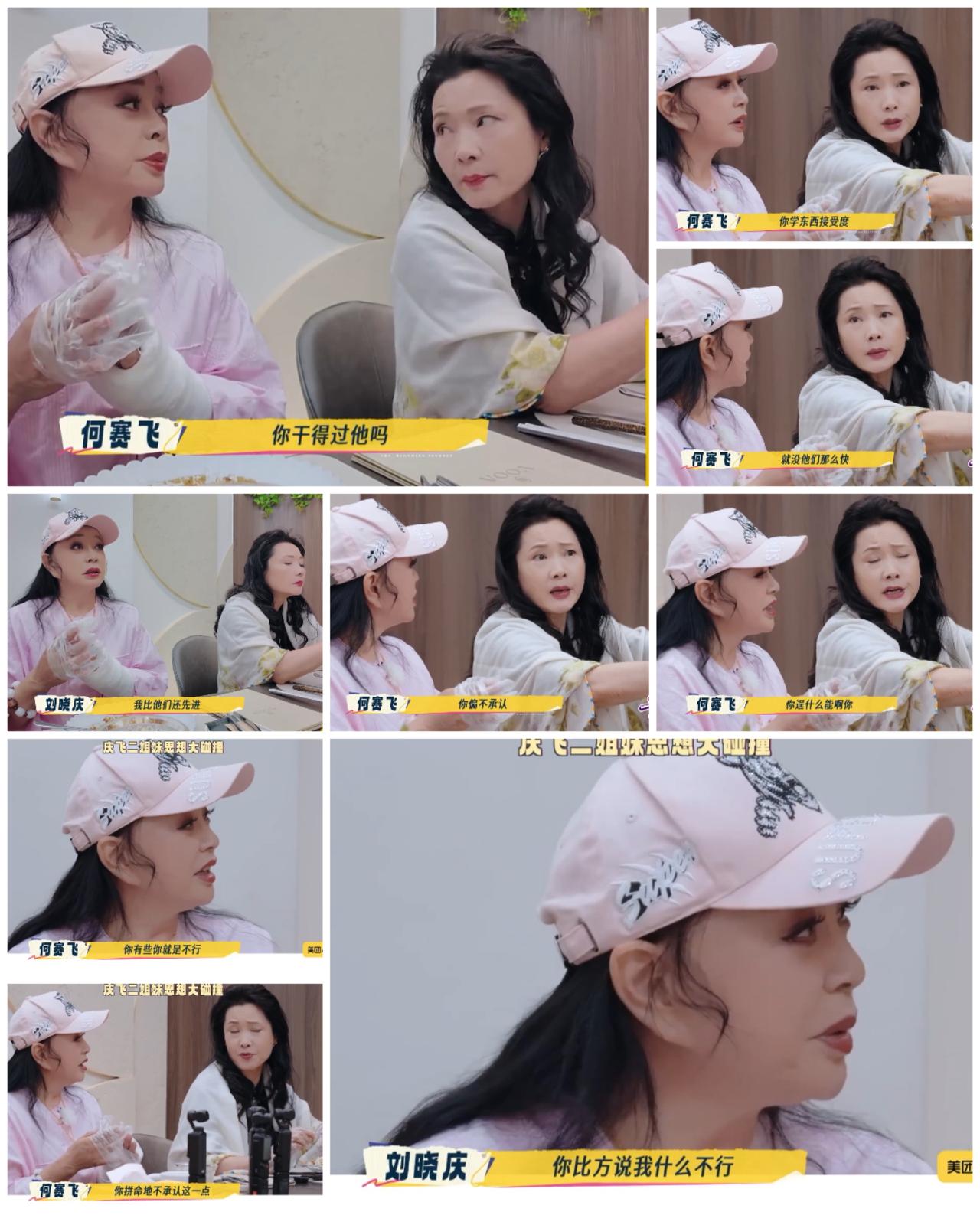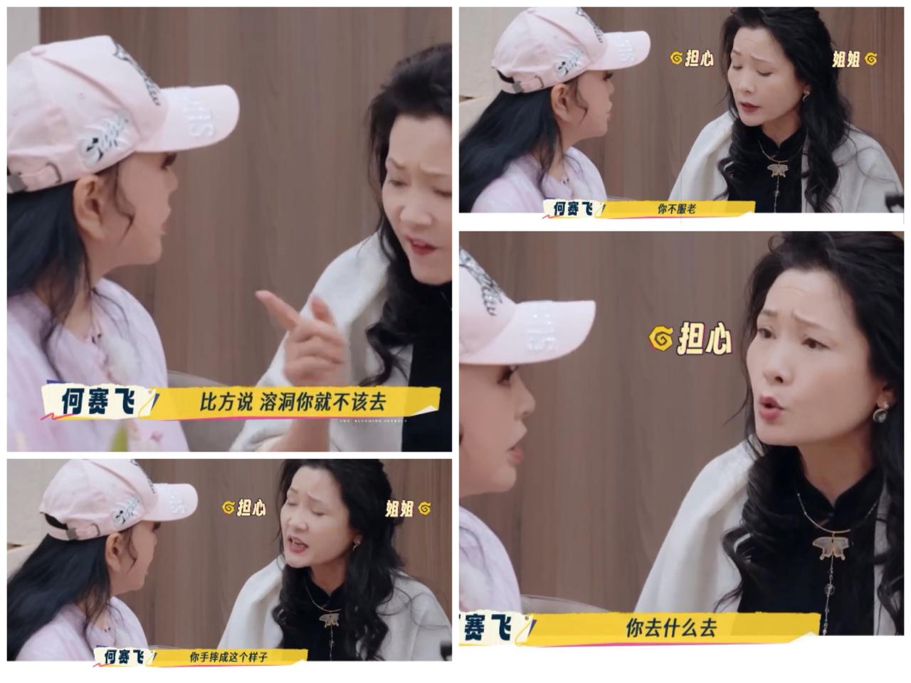 何赛飞这次踩到刘晓庆的“雷区”, 吵得不可开交, 吓得张柏芝不敢吭声。 何赛飞强调当下的年纪 无法跟年轻人同步,就是“服老” 而刘晓庆不同意。 她主张自己跟年轻人没有距离, 有时还领先年轻人,就是“不服老”。 何赛飞的观点是符合大多数 老年人的情况的, 而刘晓庆的的观点仅限于她 个人的情况。 你看, 刘晓庆当天,全身小粉红套装, 帽子是粉色的,穿着超短裤, 俨然一副少女打扮。 何赛飞这个时候, 说她要服老, 刘晓庆怎么会高兴。 “不服老”就是支撑她生存下去的 动力与精神支柱。 何赛飞眼看吵不过就晓庆, 对着镜头就指责她逞能 去溶洞参加极限运动, 结果把自己摔到手了。 其实刘晓庆如果不逞能, 就不会来参加这个综艺, “逞能”与“不服老”就是刘晓庆 生存下去的支撑点。 何赛飞想摧毁的不仅仅是一个 刘晓庆的一个观点, 而是她生存下去的动力。 所以, 刘晓庆不能输, 她坚持不服老, 她才有生存下去的动力, 不然她的精神宇宙会崩塌。