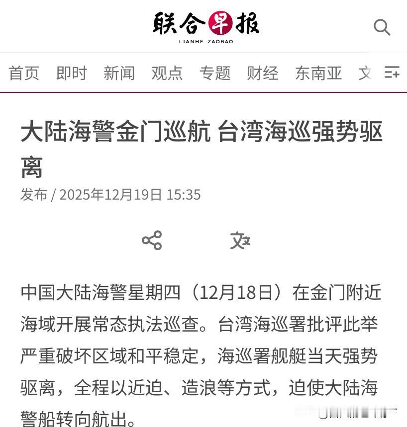突发,大陆金门巡航,台当局:硬扛1小时,他们才走 随着赖清德增加台湾的防卫预算之后,大陆对其脖子上的绳子越拉越紧,从11月28日对金门又展开了常态化巡航。 12月19日据中国大陆海警官方发文,称18日在金门展开了执法巡查,在巡查期间采取了,识别查证、喊话警告,对重点海域进行了加强管控,任务圆满完成。 然而让人没有想到的是在大陆发文不久之后,台当局指责,在12月18日下午2点54分他们看到有四艘大陆渔船,进入了金门水域。台当局第一时间出动了巡防艇应对。采用近迫、造浪,以及中英文喊话等方式在4:17的时候,成功阻止大陆海警船继续深入台湾水域 看完这里真的是让人无语了,赖清德当局在赢学方面也是登峰造极,还造浪,中英文喊话,制止大陆继续在该海域巡逻。真的是无耻到极点,明明是巡逻结束了,到他嘴里就变成了制止了。金门海域属于大陆水域,海警船愿意呆多久就呆多久。关赖清德屁事