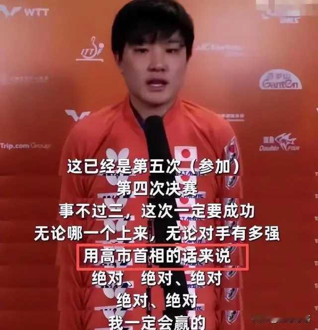 纯日本血统的福原爱都能得到国内球迷的喜欢,甚至连石川佳纯也受球迷喜欢,可有着中国血统的张本智和却被广大国内球迷一致鄙弃。 无他,是因为他太想做一个“堂堂正正”的日本人了。 想做日本人本身也无可厚非,可他把做日本人的根本原因,就是在赛场上吼得够大声,赢中国队赢得次数够多。 于是,他把那个叫嚣“台湾有事就是日本有事”的高市早苗的话奉为“信念”。公然学着高市大叫,绝对,绝对,绝对,绝对,我一定会赢的。 正因为他表现得“比日本人更日本人”,直接击穿了中国人的底线,他也成了中国球迷最为鄙视的人。