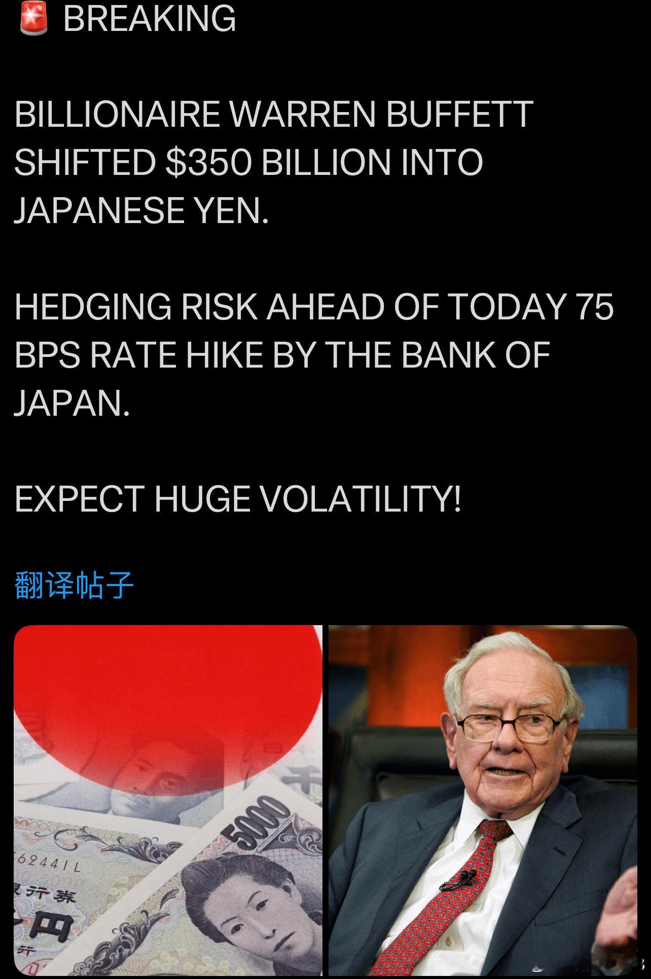 🚨突发亿万富翁沃伦·巴菲特将3500亿美元换成了日元。日本央行今日加息 75 个基点前,如何对冲风险。巴菲特在日本央行加息前套现日元,凸显了日本目前对全球流动性的重要性。