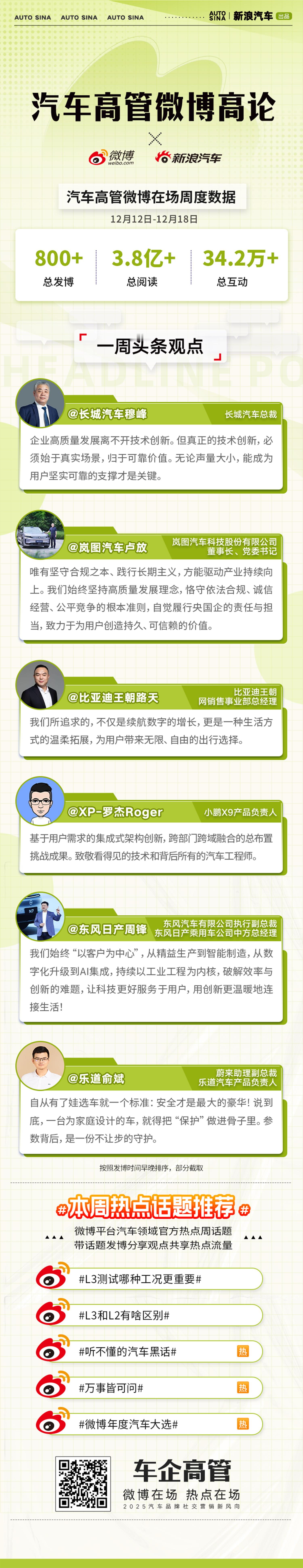 将竞争焦点从参数与声量,转向以安全为基石、场景为驱动、为用户创造长期可靠价值的新阶段;汽车高管微博高论,省流速览微博一周高管精彩观点!