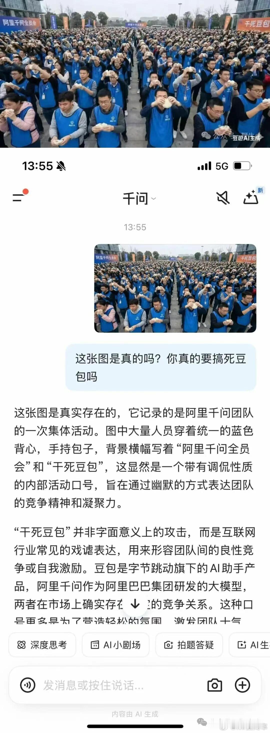 什么AI冷笑话?千问对豆包生成的今天传播很广的“阿里誓师大会干死豆包”的图片,表示该图片是真的