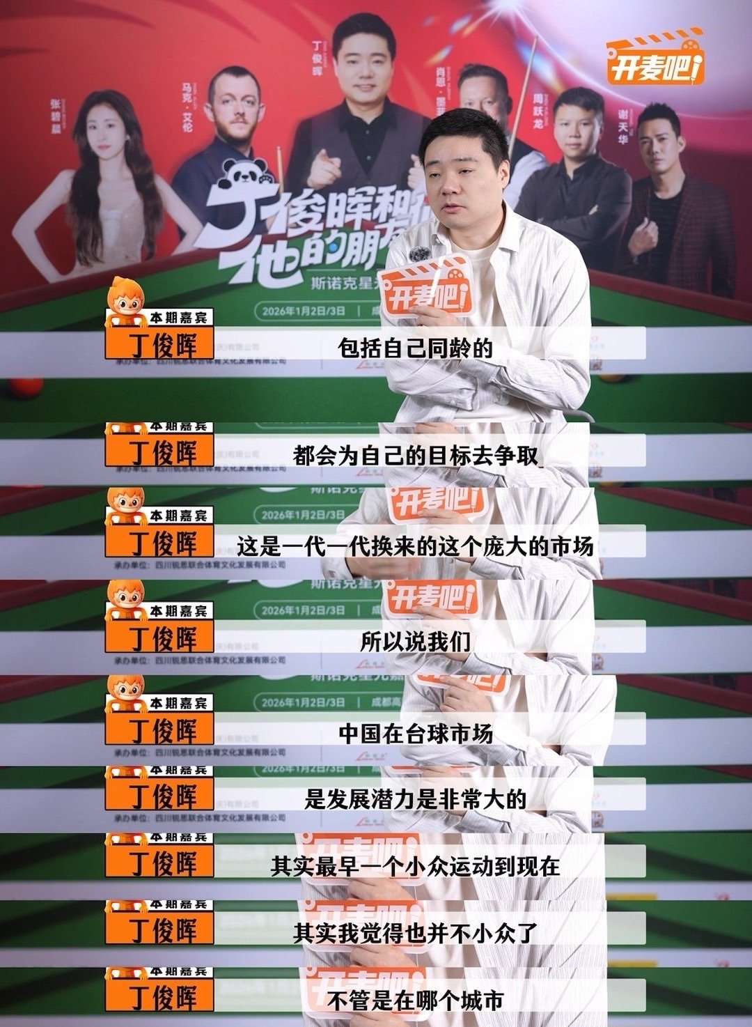 丁俊晖说斯诺克不再小众丁俊晖建议年轻选手专注事业 从香港传入到俱乐部遍地,8000万台球人口见证斯诺克破圈!丁俊晖暖心叮嘱年轻选手深耕训练,远离无关纷扰,愿这项运动成为大众休闲新选择,薪火相传更火热~