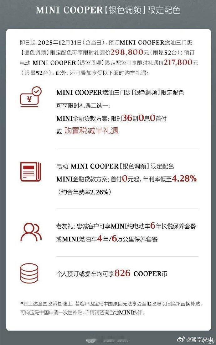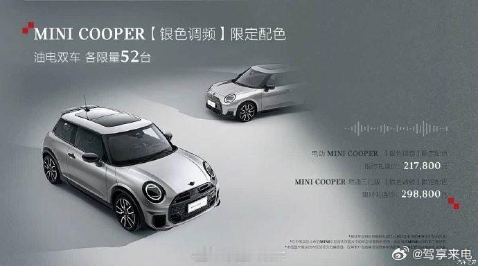 MINICOOPER银色调频限定版正式上市复古潮人集合!MINI COOPER 银色调频限定版官宣上市,油电双车各限量 52 台,售到 12 月 31 日,手慢无系列~颜值直接戳中审美!车身车顶同色的流光银配色,复古感拉满,燃油版内饰红黑撞色 + 赛旗饰面 + JCW 运动座椅,电动版首次用全黑 Vescin 材质座椅,质感绝了。动力也在线,燃油版 2.0T 发动机 + 7DCT,电动版续航 462km,日常代步通勤都够用。电动版 21.78 万起,燃油版 28.88 万起,限量款自带专属气场,喜欢 MINI 的潮人可别错过这波专属浪漫
