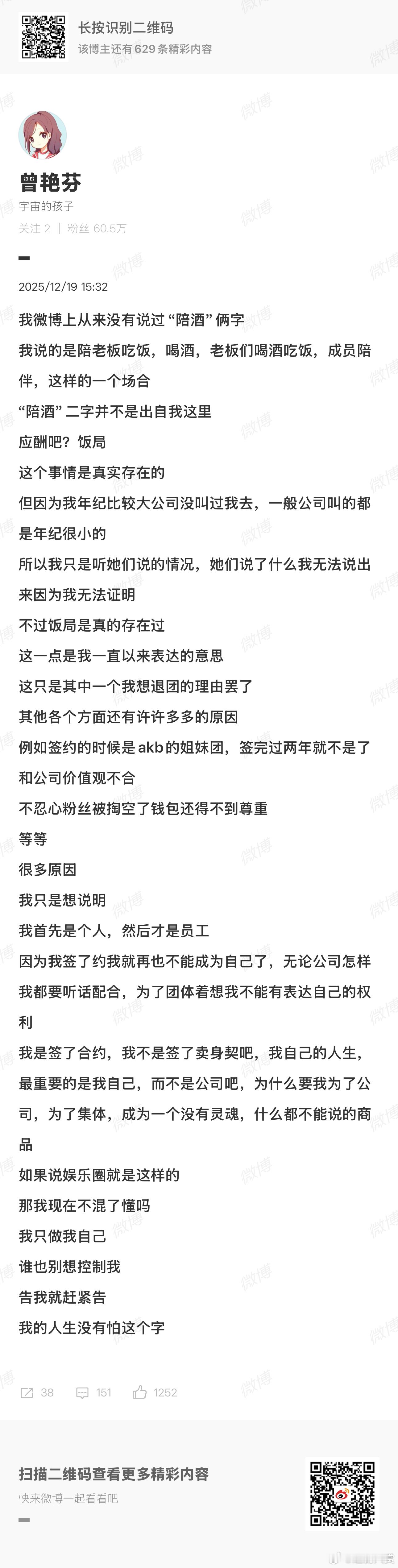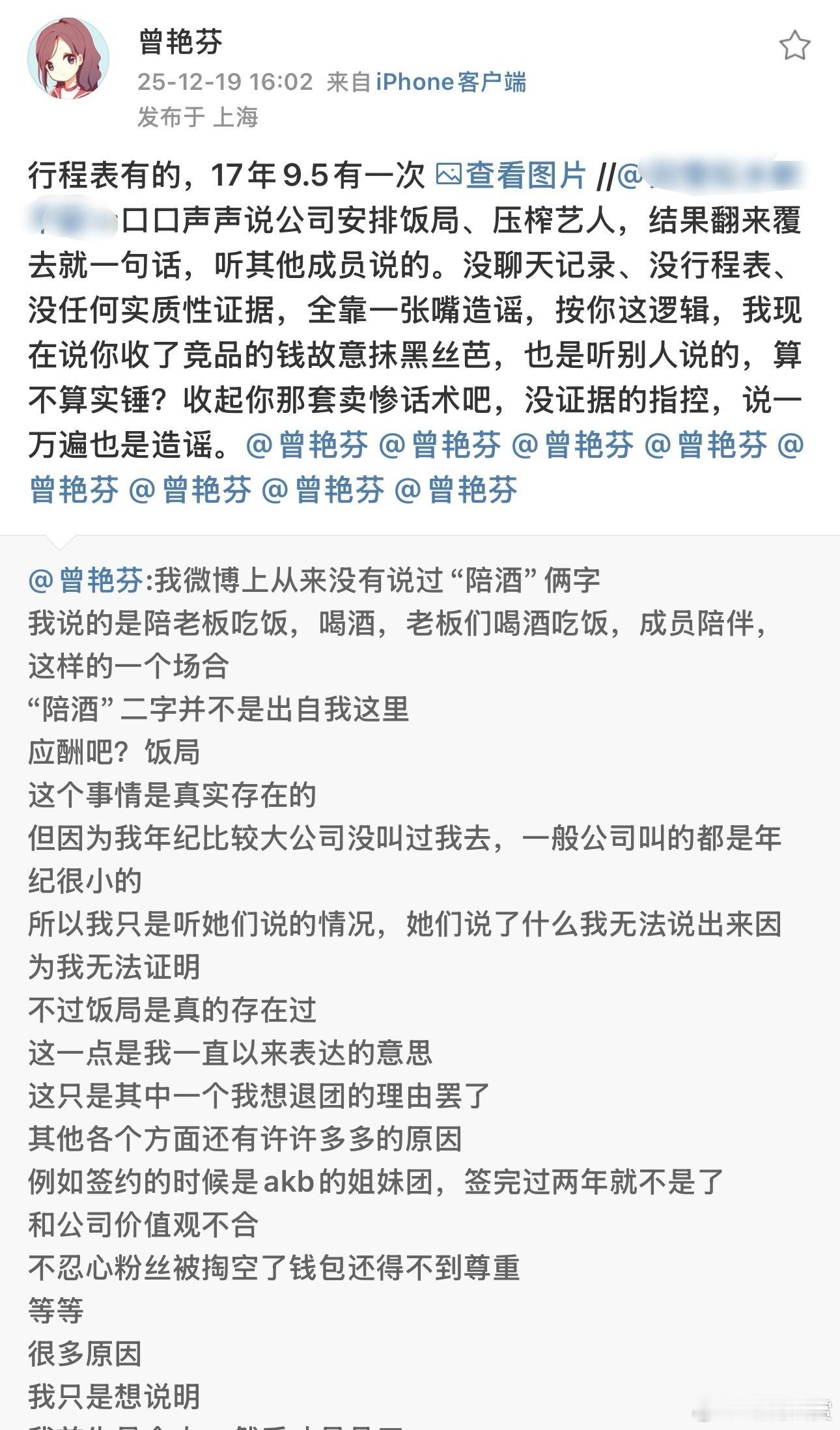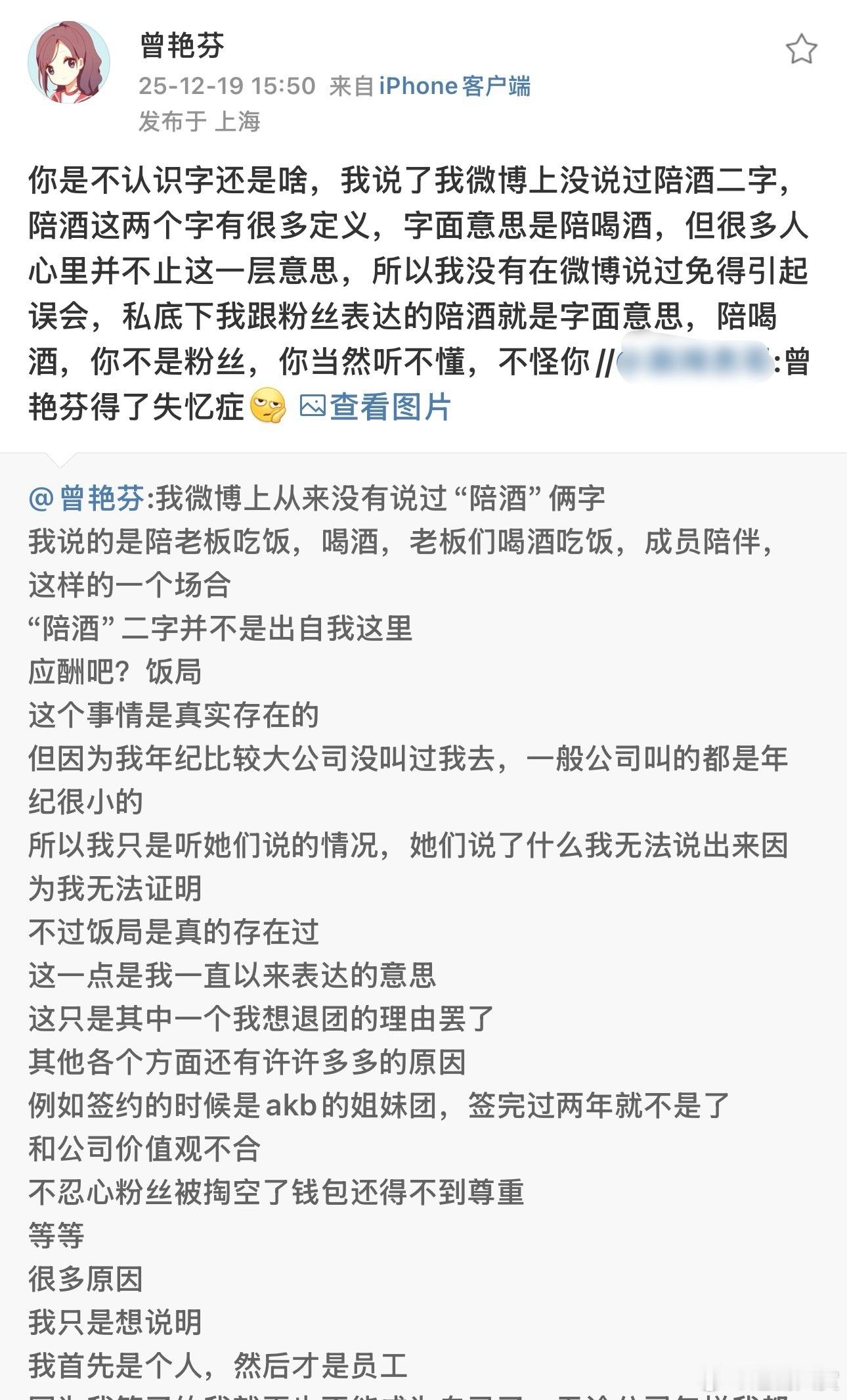 曾艳芬从来没有说过陪酒俩字 曾艳芬发文称:我从微博上从来没有说过“陪酒”俩字,不过饭局是真实存在过,还喊话丝芭“告我就赶紧告 我的人生没有怕这个字”