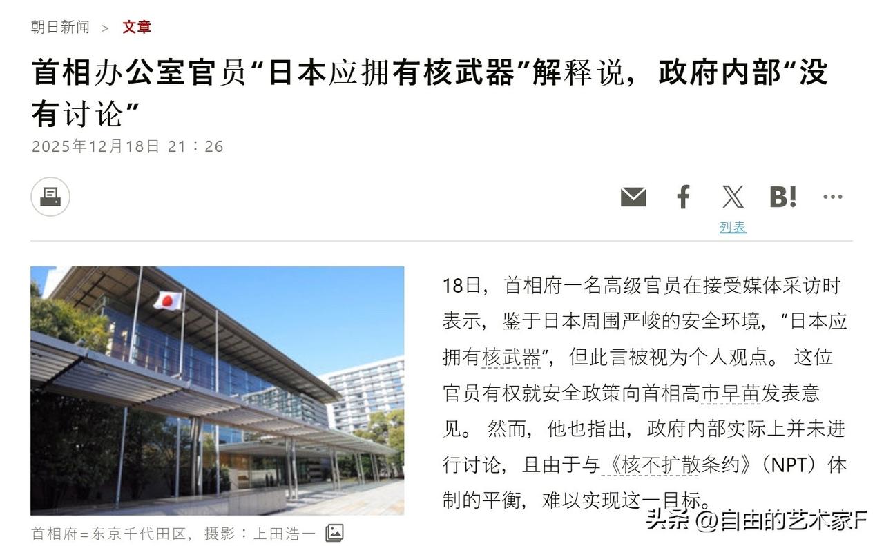 小泉进次郎:不排除日本拥核选项 日本真的是一个烂摊子,12月18日,高市内阁一名高官称,由于日本周边安全形势严峻,所以他认为日本为了国家安全可以拥有核武器,吃方言论,引发了外界的讨论。 面对着强大的舆论压力,12月19日日本内阁官房长官称日本坚定奉行无核三原则作为政策指导方针。甚至否认了和美日进行核共享的可能性。 宣称日本是一个爱好和平的国家,即便是美国同意在日本内部部署核武器,日本也不会同意的,因为这违反日本无核三原则。 但是木原稔似乎没有和日本内部进行沟通,小泉进次郎接受记者采访,被问及该问题的时候是这样回答的,为了维护和平生活,我们理应继续考虑所有选项,不排除任何可能性。 很明显,这群极右翼分子正在不断地试探国际底线,试图摆脱国际秩序约束,加速日本重回军事国主义国家。不过这完全是日本人的痴心妄想,中国和俄罗斯不会同意,就连美国人也不会同意的,毕竟美国给日本定义的就是一只听话的狗,受珍珠港的影响,美国绝对不会让日本磨尖牙齿来再咬自己一次
