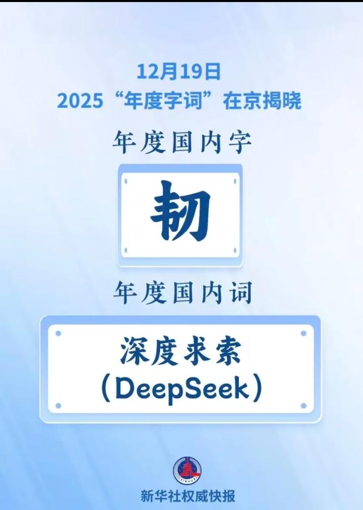 “汉语盘点2025”活动19日在京揭晓“年度字词”,“韧”,“深度求索(DeepSeek)”从万千词汇中脱颖而出,分别当选年度国内字、国内词。 这个韧字选得好! 用它来形容当今社会情形下的生存状态,再准确不过了。 我们个人,都可能面临着各种各样的生存状况,在学习,就业,工作和婚恋中,都会遇到挫折,甚至是严重的打击。 能否挺得住,能否走下去,就看我们是否有足够的韧性。 当处在艰难困苦境地时,有韧性,就会百折不挠,就不会绝望。