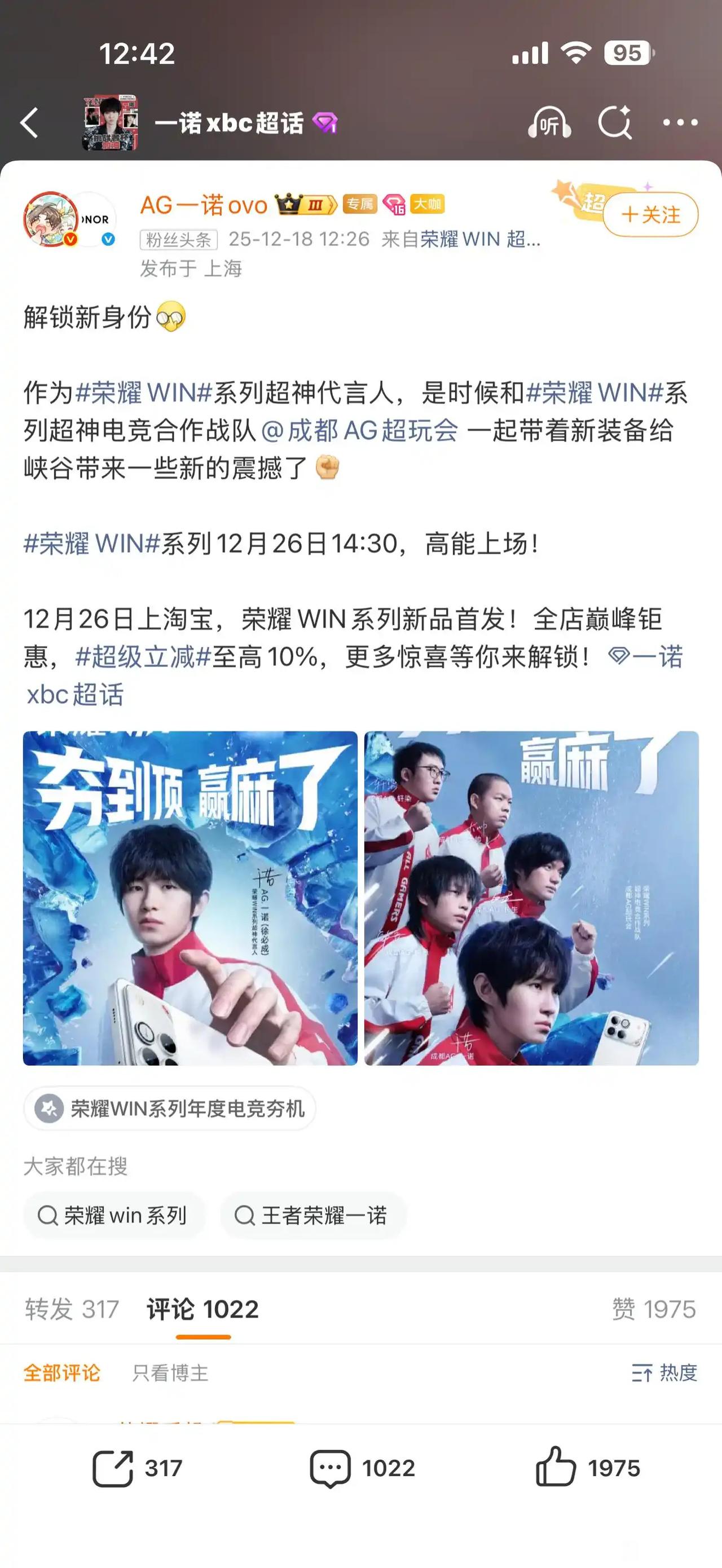 AG这两年的事业运真的牛,一诺个人代言荣耀WIN。 不止自己升级代言人了,还从去年的个人合作荣耀,到今年带着ag,让ag也变荣耀的合作战队了。这个真是个人商务带动战队商务了。