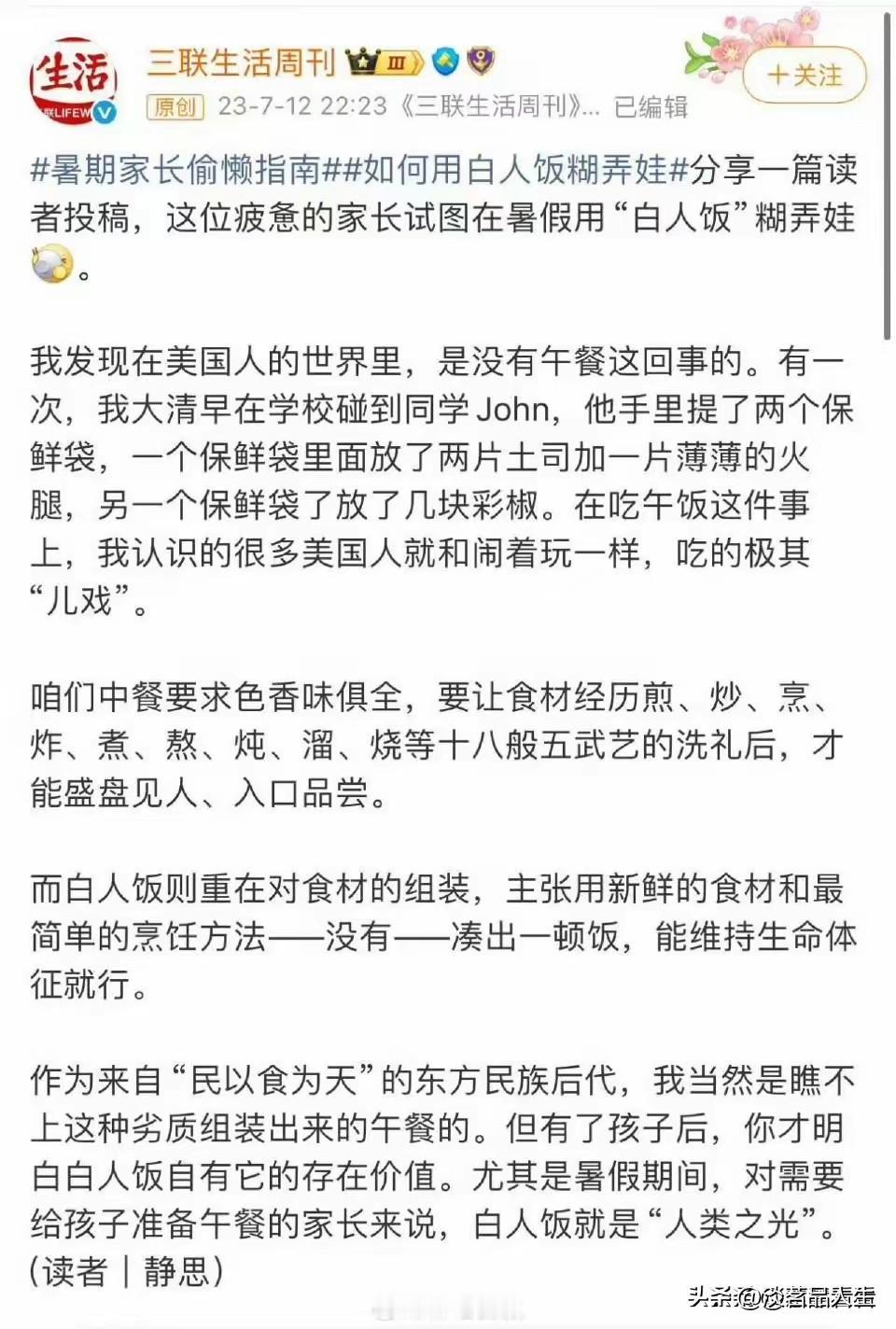 三联为什么删除下雪的那篇微博,看看这篇“白人饭”的论调你就知道了。 “白人饭”听着陌生,其实就是两片面包加片火腿,然后配上几片彩椒罢了。而看似并没有营养的所谓“白人饭”,却被三联称为“人类之光”。 这就是三联笔者口里所谓的新鲜食材和简单烹饪出来的美食,除了那几片彩椒,哪里能谈得上新鲜,烹饪更谈不上了吧,加热一下面包,切两片火腿,这也能算烹饪吗。 但笔者却认为这是“人类之光”,比我们的煎炒烹炸不知道好上多少倍。不知道他是不是每天都吃这些食品,会不会造成营养不良。