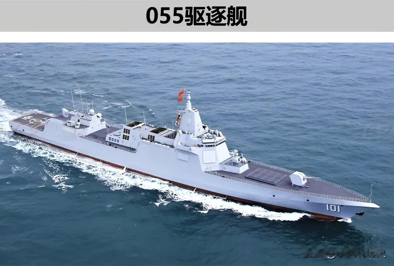 国产055驱逐舰 055型导弹驱逐舰是中国海军现在服役的第四代驱逐舰,这款舰的设计方是中船重工701研究所,建造方是上海江南造船厂和大连船舶重工。 它用的是全燃联合动力,装了封闭式的综合射频桅杆,还有112个舰载通用垂发单元,能实现区域防空、反导、反舰、反潜,还能打击岸上目标。 在海军的作战系统里,055型驱逐舰是航母战斗群和远洋机动编队的指挥中心。它的核心工作有两个:一是作为防空反导的核心,布置好几层防空火力网,组织编队里的舰艇一起作战;二是作为编队的信息处理中心,掌握战场情况,给各类武器提供协同制导。 这款驱逐舰,除了航母和两栖攻击舰之外,是二战后亚洲国家建造的吨位最大的水面作战舰艇。 第一批造了八艘,已经全部服役;第二批规划的也是八艘,正在一步步建造和服役。 基本规格 类型:导弹驱逐舰 服役期间:2019-至今 全长:180米 吃水:6.6米 现役:8艘 全宽:20米 排水量:12000-13000吨(满载) 动力方式:全燃联合 最高速度:超过30节 发动机:4台CGT-25M燃气轮机 舰载机:直-20F反潜直升机×2 搜索系统:H/LJG-346B型C/S波段有源相控阵雷达等 武器系统:H/PJ-45型单管130毫米舰炮x1、H/PJ-11型11管30毫米舰炮×1、112具舰载通用垂直发射系统、鹰击-18家族反舰导弹/巡航导弹、鹰击-21高超音速反舰弹道导弹、红旗-9B中远程防空导弹、鱼8火箭助飞鱼雷、长剑家族巡航导弹、24联装红旗-10A近程防空导弹×1。