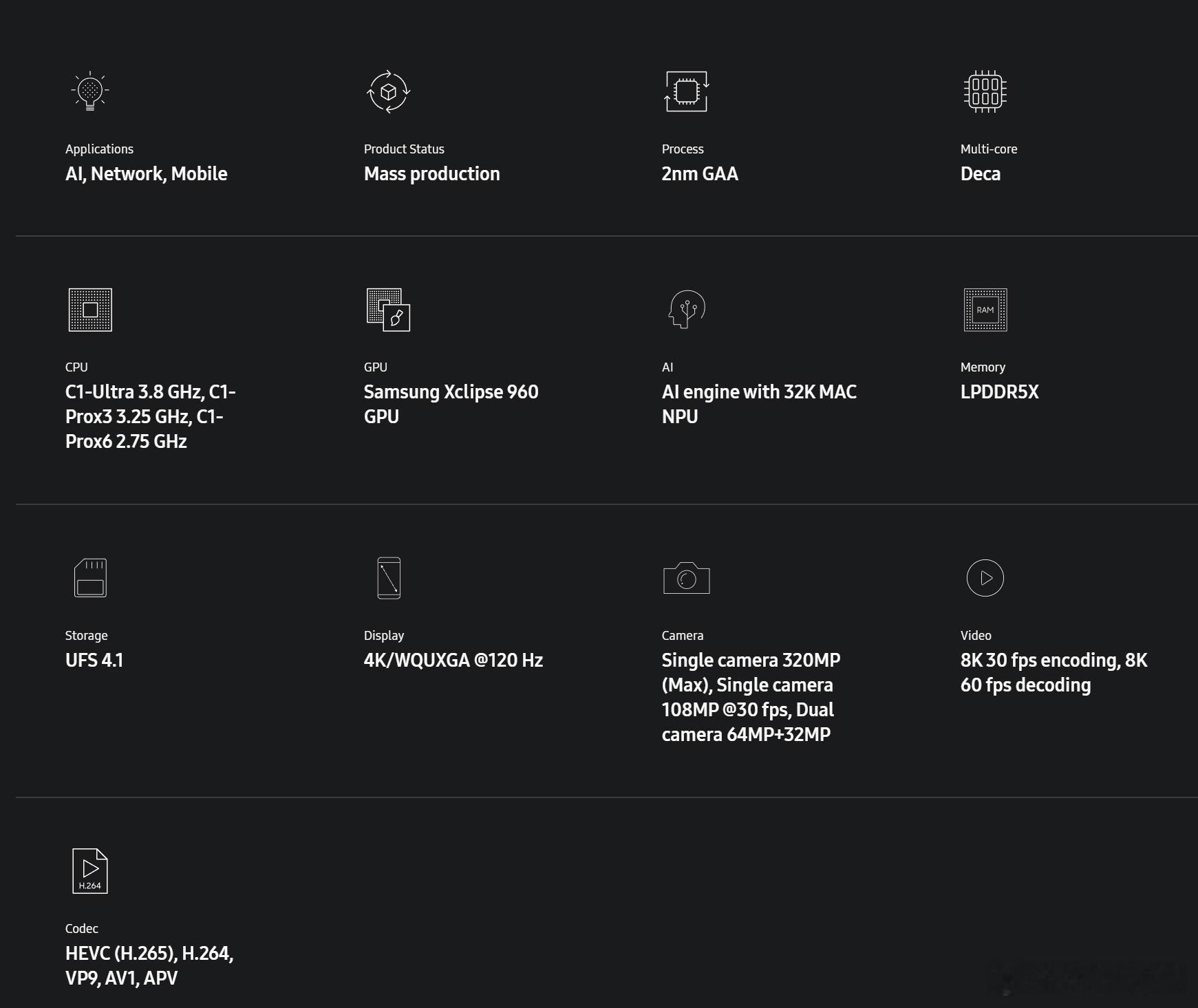 Exynos 2600发布,首个2nm GAA工艺旗舰Soc:1个3.8GHz C1-Ultra;3个3.25GHz C1-Pro;6个2.75GHz C1-Pro;总共10核心,对比发哥天玑9500的1+3+4,Exynos2600去掉了性能核(Premium),1个超大核+9个能效核,CPU性能提升39%,Geekbench6目前能查到跑分成绩在单核3400+,多核11600+。Xceipse 960 GPU性能相对上代翻倍,支持LPDDR5X+UFS4.1。采用HPB技术,使Soc内部热量能更快向外传导,提升高负载稳定性。不过具体表现嘛,还得实测看,毕竟Exynos2500用3nm GAA实际表现,就完全没追上早大半年发布的8Elite和9400;