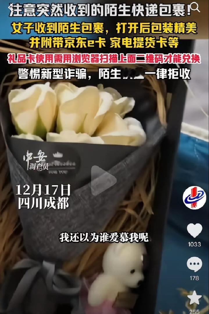 近日,四川成都的一女子收到一个陌生的包裹,打开后发现是一束鲜花和一个玩偶小熊,她以为是哪个爱慕她的男士送的,结果却出乎人意料。 该女子表示收件人姓名处写的是以前的网名,那个名字早就不用了,打开包裹后,除了一束花和玩偶外,还有一张某东的购物卡,打开后里面有张50元的某东e卡和家电提货卡。在购物卡的包装上写着,需要用浏览器扫描上面的二维码,联系客服兑换。该女子称只要是用浏览器扫描二维码的,那就是诈骗。 有网友称她收到的是笔记本和一张扫码卡片,收件人是她的公公,但是她公公已经去世一年多了。 还有网友称她也收到了,而且还扫了码,还好最后反应上来,赶紧退出,最后一起扔了。 看到这个新闻,我突然想起来上周,我前公司的同事给我打电话,说是有一个我的包裹送到了公司,我当时还觉得奇怪,我都离职两年多了,而且我所有的收货地址全都改成了家庭地址,怎么还会有包裹寄过去呢?后来我想有可能是诈骗。我直接告诉前同事扔掉就行了,现在看来百分百就是骗人的包裹了。 这些骗子真是无孔不入,不光扒出你不用的网名,连离职两年的旧地址都能翻出来,甚至还敢冒用逝者信息。说白了就是拿小恩小惠当诱饵,等着你扫二维码上钩。 你以为是捡便宜,其实一扫码,个人信息可能就泄露了,甚至银行卡里的钱都可能被转走。遇到这种来路不明的包裹,千万别好奇,别手软,直接扔垃圾桶或者交给快递站处理就完事。贪小便宜吃大亏这句话,真不是随便说说的。各位读者你们怎么看?欢迎在评论区讨论。