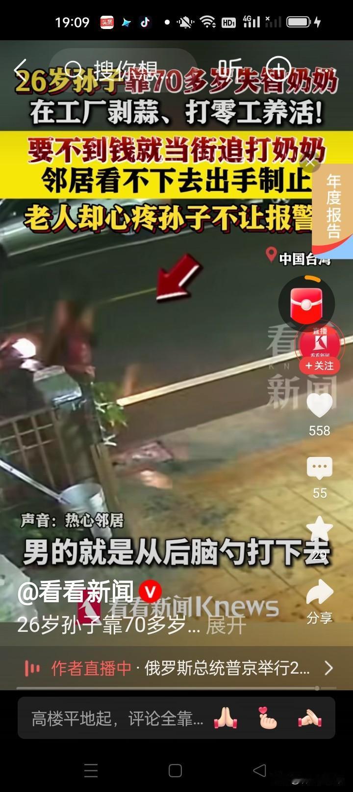 26岁孙子要不到钱当街殴打失留奶奶!26岁本是风华正茂、拼搏奋斗的年纪,可台湾彰化县伸港乡这个26岁无业男子,却干出当街殴打失智奶奶这种天理难容的事。他追着奶奶,用安全帽疯狂殴打,简直丧心病狂。 这奶奶也是可怜,在工厂剥蒜打零工,微薄的收入还要养着这个孙子。邻居让报警,她还念及亲情不忍下手。说到底,这就是长期溺爱惯出来的恶果。小时候有求必应,让他觉得索取理所当然,根本不懂感恩。这不仅是个人的悲哀,也给所有家庭敲响了警钟,教育若缺失,养出的可能就是“白眼狼”。 ‘