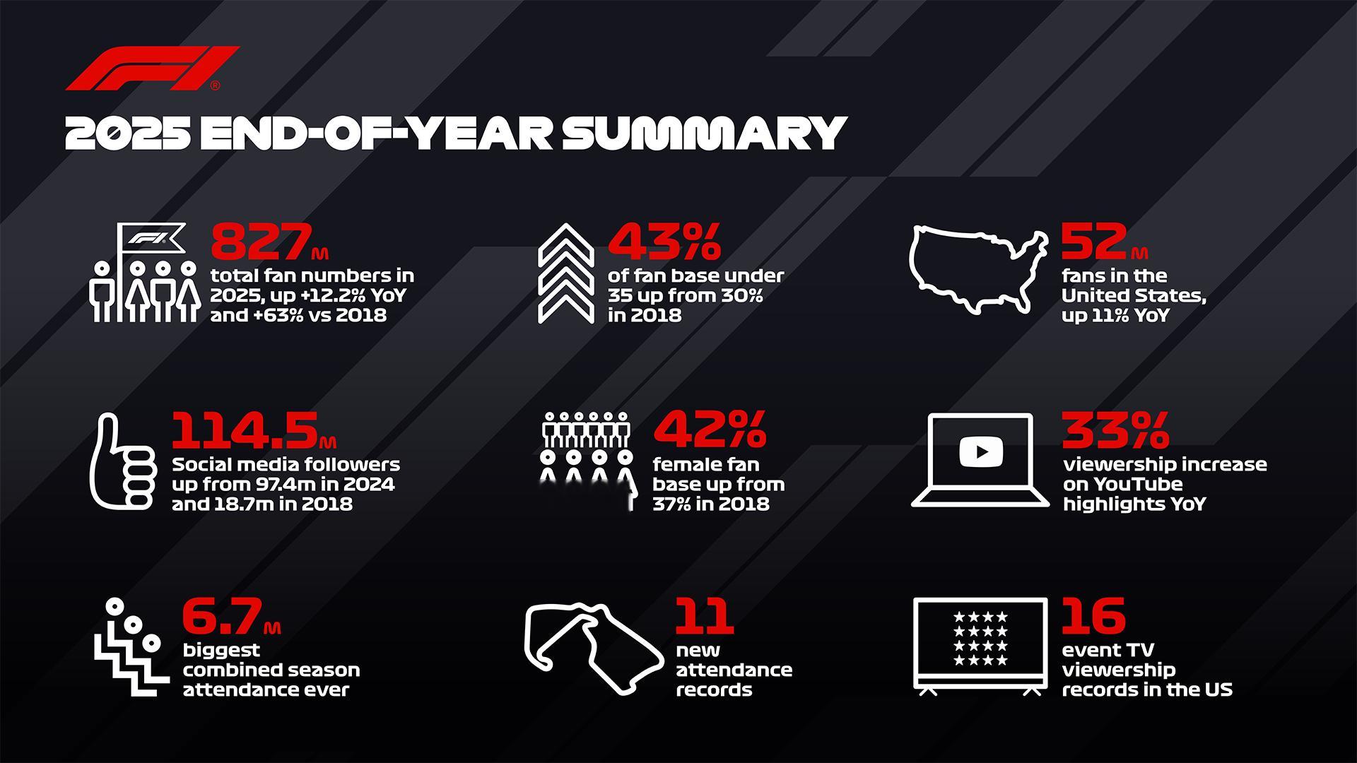 F1公布了2025赛季粉丝增长趋势、观赛人数、社交媒体端数据报告:1、增长与趋势全球粉丝群体持续扩大,并呈现更年轻化、更具多元化的趋势:• F1 全球粉丝规模达到 8.27 亿,成为全球最受欢迎的年度体育赛事;同比增长 12%,较 2018 年增长 63%。• 以全球粉丝规模计,F1 已成为全球最受欢迎的体育联盟,粉丝规模较第二大体育联盟(NBA)高出 11.4%。• 粉丝群体持续年轻化,35 岁以下人群占比达 43%,同比新增 5100 万。• 过去一年新增粉丝中,57%为 35 岁以下。• 女性粉丝占比达到 42%(2018 年为 37%),同比新增 4300 万。• 今年新增粉丝中,48%为女性。• 全球各区域粉丝规模持续增长:欧洲 1.154 亿、英国 1670 万、中国 2.211 亿、印度7880 万。依托美国三场各具特色的大奖赛,美国市场继续保持强劲增长势头:• 美国粉丝规模达到 5200 万,同比+11%。• 美国的赛季赛事直播平均收视较 2024 赛季均值提升+21%。• 美国是 F1 YouTube 观看量最大的市场(2025 年 1.71 亿),也是社交媒体粉丝规模最大的市场(YouTube / TikTok / Instagram 合计 630 万);美国社交粉丝同比+17%。2、现场观赛人数2025 赛季现场观赛人数持续刷新纪录:• 赛季总现场观赛人数:670万,为史上最高(2024年650万、2023年600万、2022年570万、2019年420万)。• 24场分站赛中有19场售罄。• 11场分站赛刷新现场观众纪录。• 4个分站周末现场观众超过40万,包括:澳大利亚(465,000)与英国(500,000)创下分站新高。• 另有10个分站周末现场观众超过30万,包括:蒙扎(369,000)、加拿大(352,000)、比利时(389,000)等。3、社交媒体与数字平台F1 连续第五年成为全球社交媒体增速最快的体育联盟。F1 全平台累计互动量超过 23 亿次,成为最具互动表现的头部体育版权方,超越 NBA、欧冠、NFL 与英超。比赛周末的精彩集锦内容持续受到观众欢迎,进一步体现数字渠道的重要性与增长潜力,尤其是年轻群体对短视频赛车内容的强烈需求:• F1 社交媒体总粉丝规模达到 1.145 亿(同比+19%,较 2018 年的 1870 万大幅提升)。• 各平台粉丝增长(相较 2024 年):o TikTok:+91%o YouTube:+53%o Facebook:+51%o Instagram:+25%o X:+1%• 中国社交媒体平台(微博、微信、今日头条、抖音)增长:较 2024 年+35%。• 阿布扎比收官战期间,F1 在五大平台(Instagram、X、TikTok、YouTube、Facebook)创下历史最高曝光与互动纪录。• F1 YouTube 频道集锦观看量同比+33%;澳大利亚站集锦首周播放达 1300 万,为频道历史第二高(仅次于 2021 阿布扎比站)。另有 12 场比赛集锦观看量超过 700万。• 与人气内容创作者 Amelia Dimoldenberg 合作的《Passenger Princess》系列,目前全平台累计播放量达 2.63 亿。F1f1