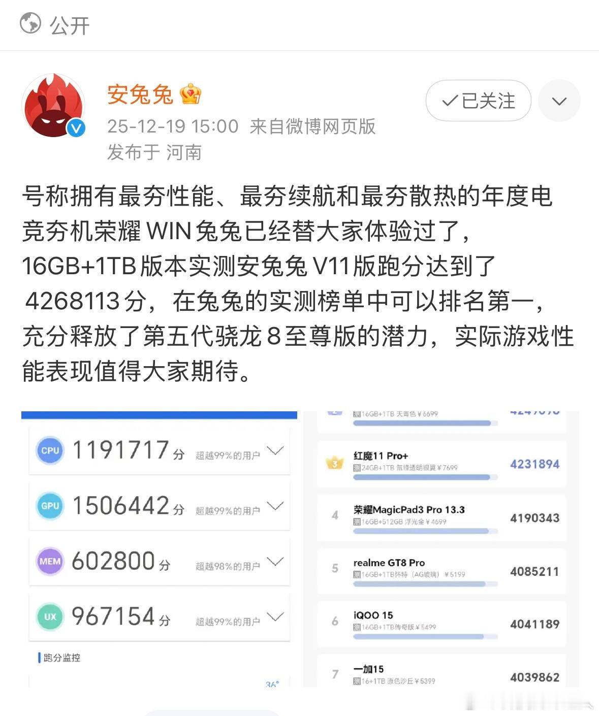 荣耀这波直接燃炸赛场!安兔兔实测跑分拿下榜首,力压一众旗舰机型。小白测评里流畅度全程在线,稳得没话说。妥妥的年度电竞夯机,这性能也太狂暴了~