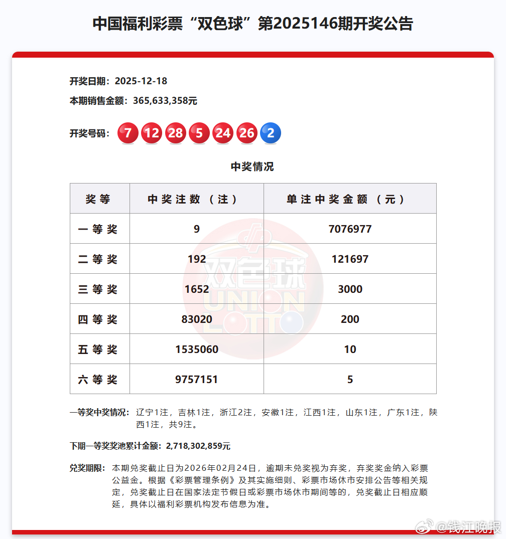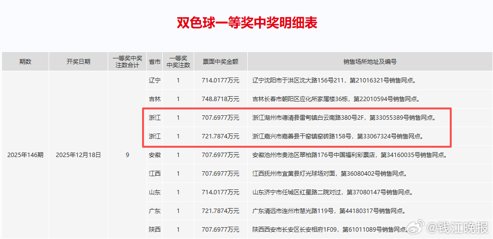 【#浙江有2人中了700万#】湖州707.69万,嘉兴721.78万!昨晚,两个双色球大奖被我省幸运儿收入囊中。12月18日晚,双色球第2025146期开奖,全国共中出单注奖金707.68万元的一等奖9注,分别出自:辽宁(1注)吉林(1注)浙江(2注)安徽(1注)江西(1注)山东(1注)广东(1注)陕西(1注)。我省这两注一等奖,1注为单式投注,单票奖金707.69万元,出自湖州市德清县雷甸镇白云南路380号2F,第33055389号福彩销售网点。另1注为复式投注,单票总奖金721.78万元,出自嘉兴市嘉善县干窑镇窑砖路158号,第33067324号福彩销售网点。本期双色球销量3.65亿元,筹集公益金1.31亿元。下期一等奖奖池金额27.18亿元。(潮新闻 实习生 宋雨萱)